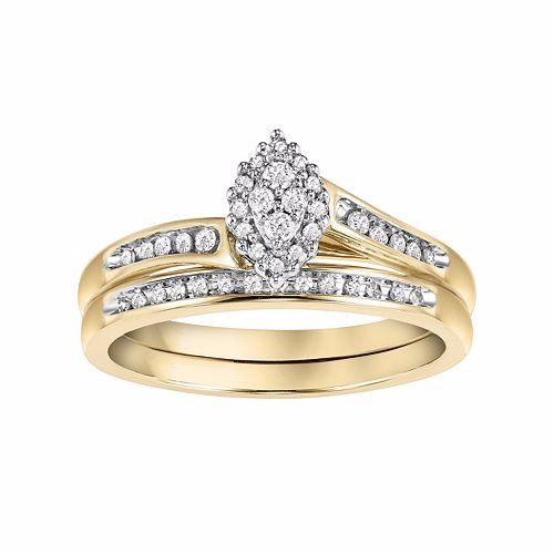 Featuring round-cut diamonds in a marquise design, this bypass engagement ring set offers a luxurious look.