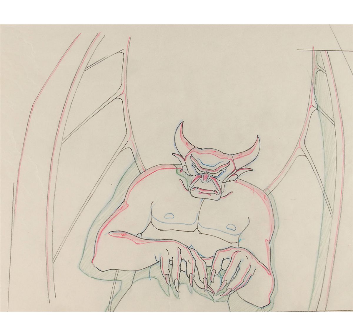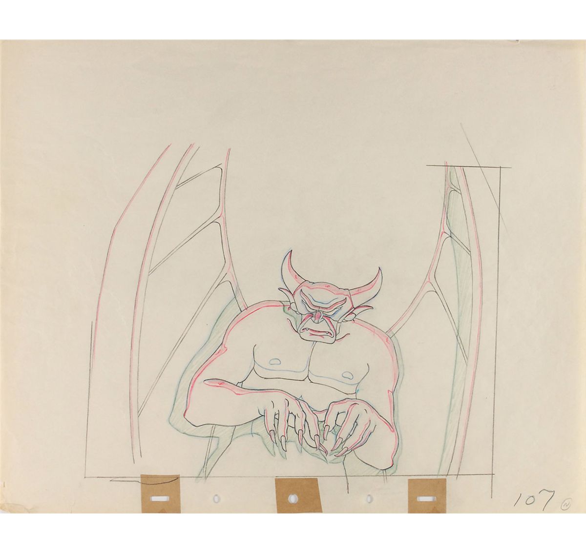 (Walt Disney Studios, 1940) Original production drawing featuring Chernabog from Fantasia, showing the villainous demon from the ‘Night on Bald Mountain/Ave Maria’ segment animated by Vladimir ‘Bill’ Tytla. Accomplished in graphite and colored pencil on untrimmed 15.5 x 12.5 animation paper. Image measures 10.5 x 8. In fine condition, with a couple trivial tears to lower left corner. Chernabog has been praised as Disney’s best representation of pure evil, as well as Tytla’s greatest triumph in animation.