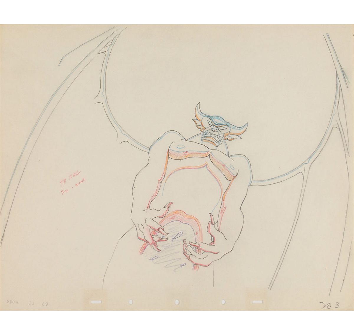 (Walt Disney Studios, 1940) Original production drawing featuring Chernabog from the Night on Bald Mountain sequence in Fantasia. Accomplished in graphite and colored pencil on untrimmed 15.25 x 12.5 animation paper. Impressive and intimidating three-quarter length image measures 15 x 12.5. In fine condition, with a small tear to bottom edge.
