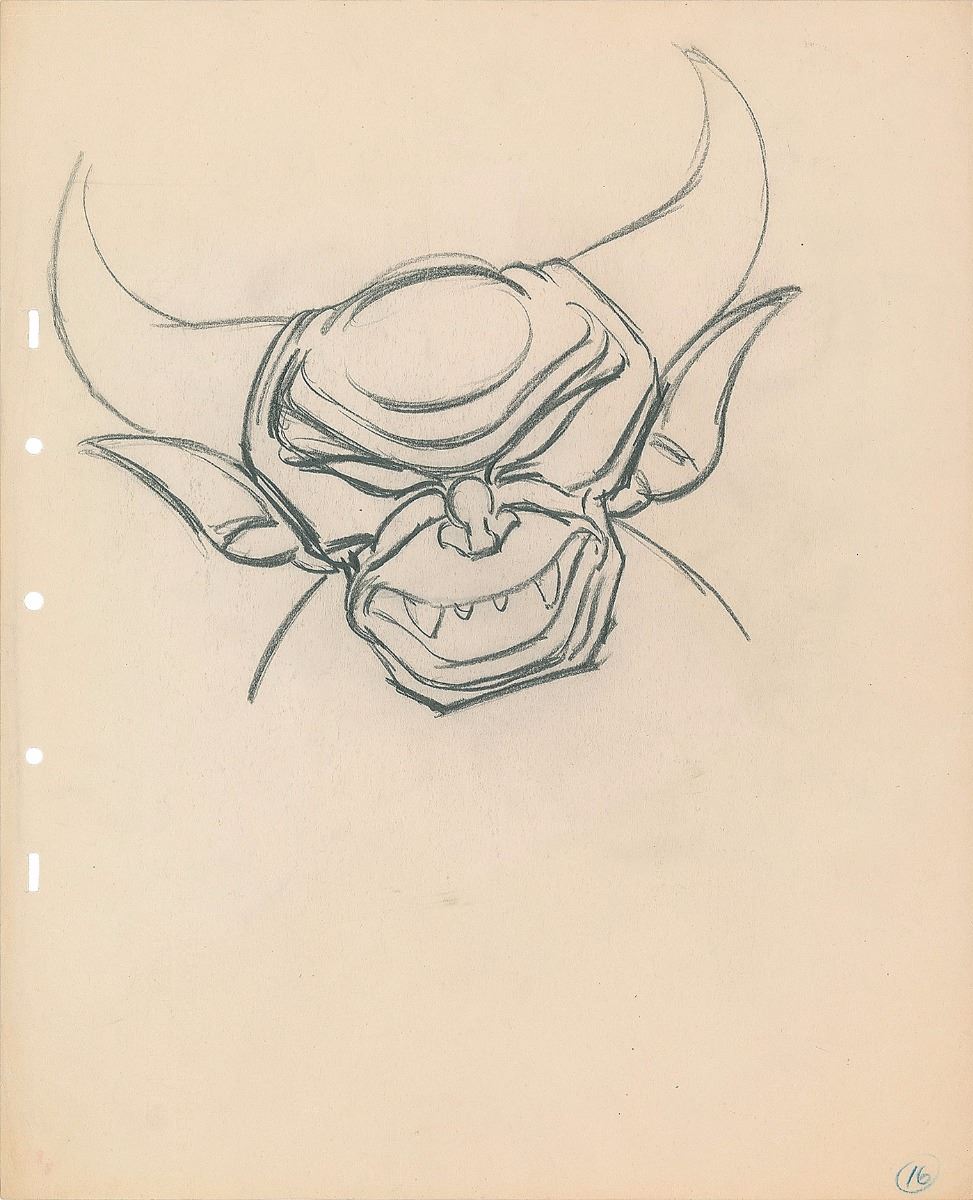 (Walt Disney Studios, 1940) Original production drawing featuring the terrifying Chernabog from the ‘Night on Bald Mountain’ sequence of Fantasia. Accomplished in graphite on untrimmed 12.5 x 15.5 animation paper. Image measures 9.5 x 8.5. In fine condition.