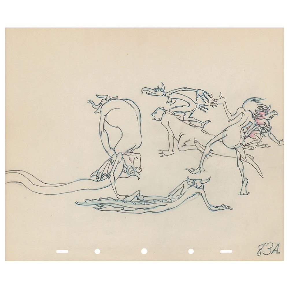 (Walt Disney Studios, 1940) Highly detailed original production drawing featuring Chernabog's grotesque demons in the terrifying 'Night on Bald Mountain' segment of Fantasia. Accomplished in graphite and colored pencil on untrimmed 12 x 10 animation paper, marked "83A" in the lower corner. Total image measures 12 x 5.5. In fine condition.
