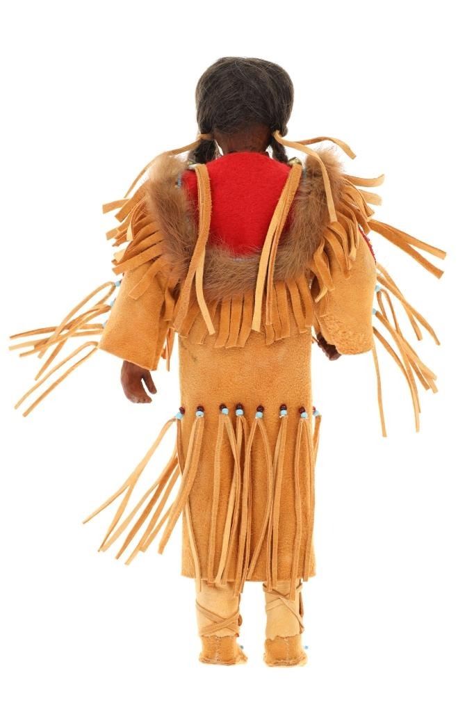 Featured in this lot is this collection of Cherokee and Apache hide and cloth dolls circa 1995 and 1940. There are two dolls in this collection. The first is a Cherokee doll with a painted wooden core that shows a hides and felt garment overtop of the body holding a feather wand in her hand and on in her braided hair with trade seed bead adornments that include translucent red, sky blue, and yellow and is marked as follows: F. Little Boy '95. The second is a Apache cloth doll with trade fabric for the dress and braided hair with ribbon adornments with trade seed beads of light green, blue coloration. The condition of this this Cherokee doll is good with no obvious signs of damage and shows good overall condition. The measurements of these dolls is 13 1/2" x 5 3/4" x 3" and 9 1/4" x 5 3/4" x 1". The collective weight of these dolls is 10oz.