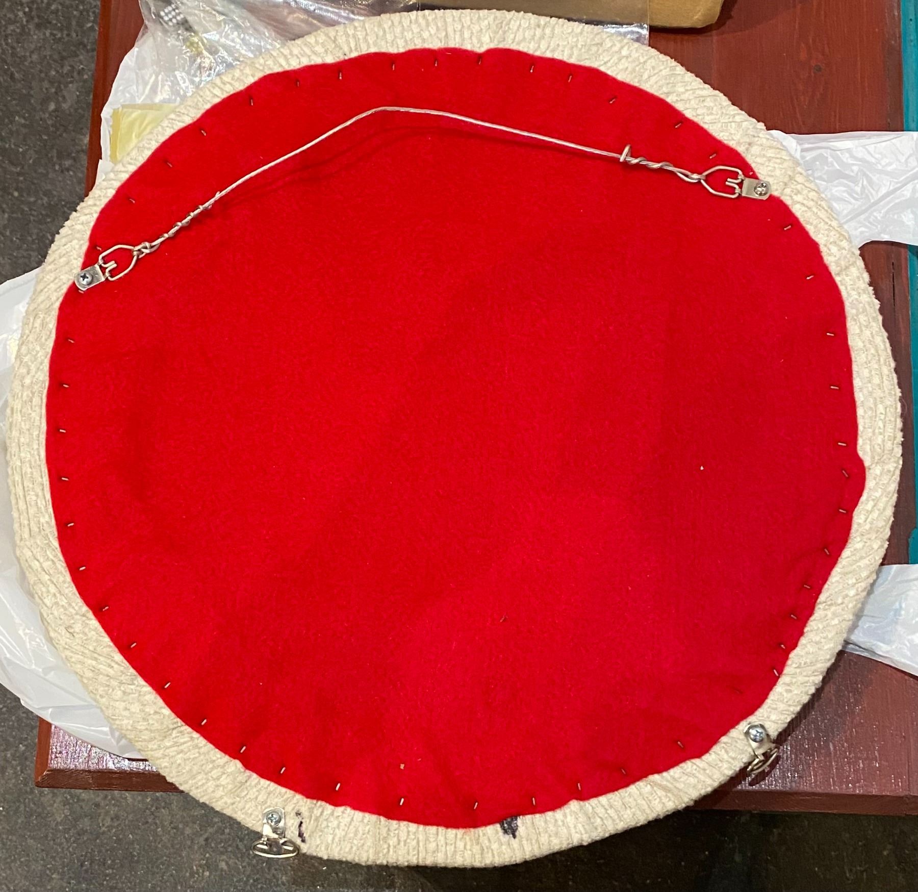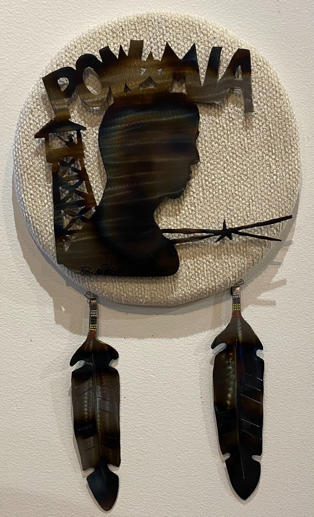 This is a 16-inch Polished and heat-treated Metal scene of a Soldier in a Prisoner of War Camp, Guard Tower, and Barb Wire Fence. It has two 13-inch Feather hanging, both feathers are removable. Mounted on a Carpet Covered Board.