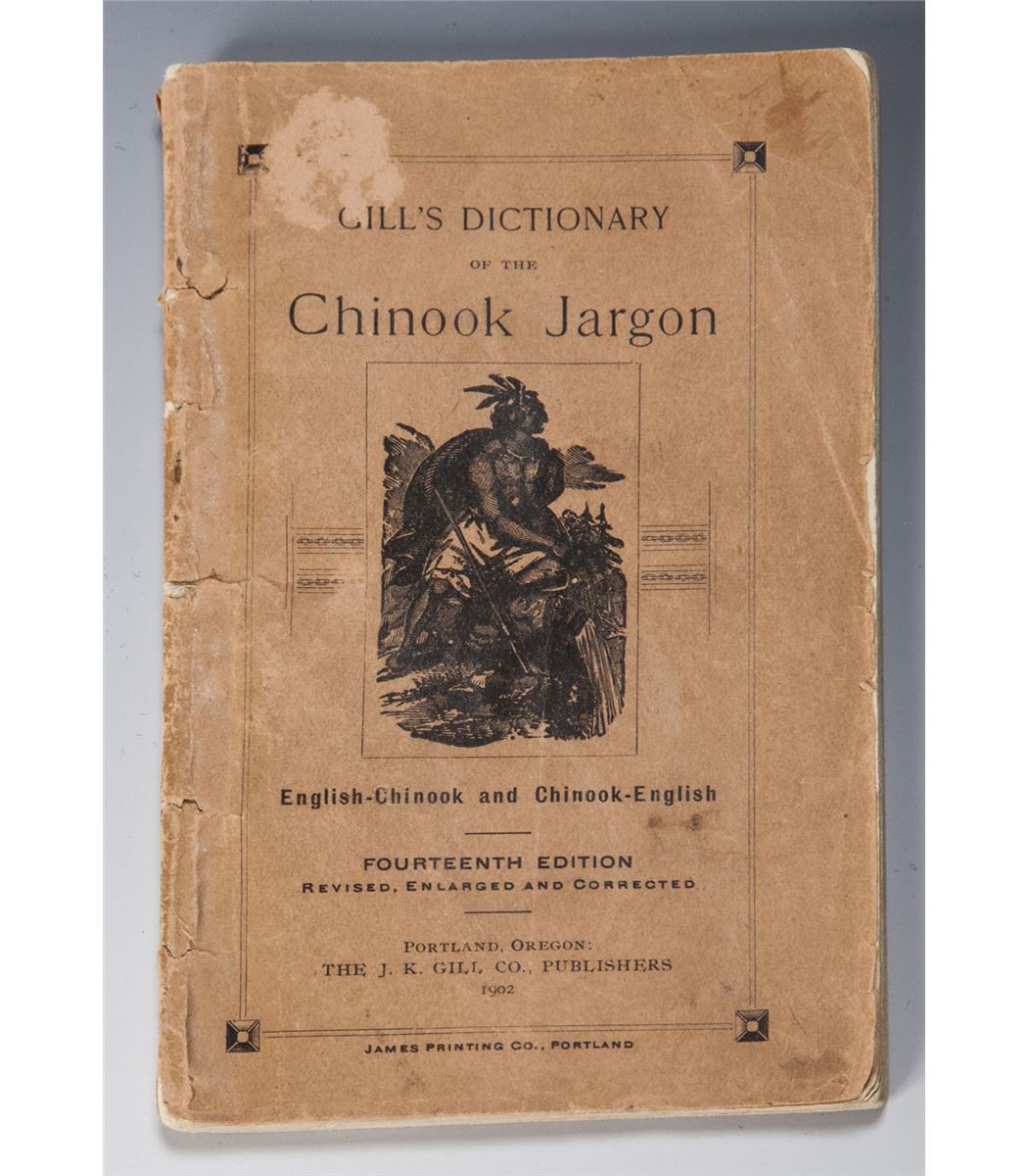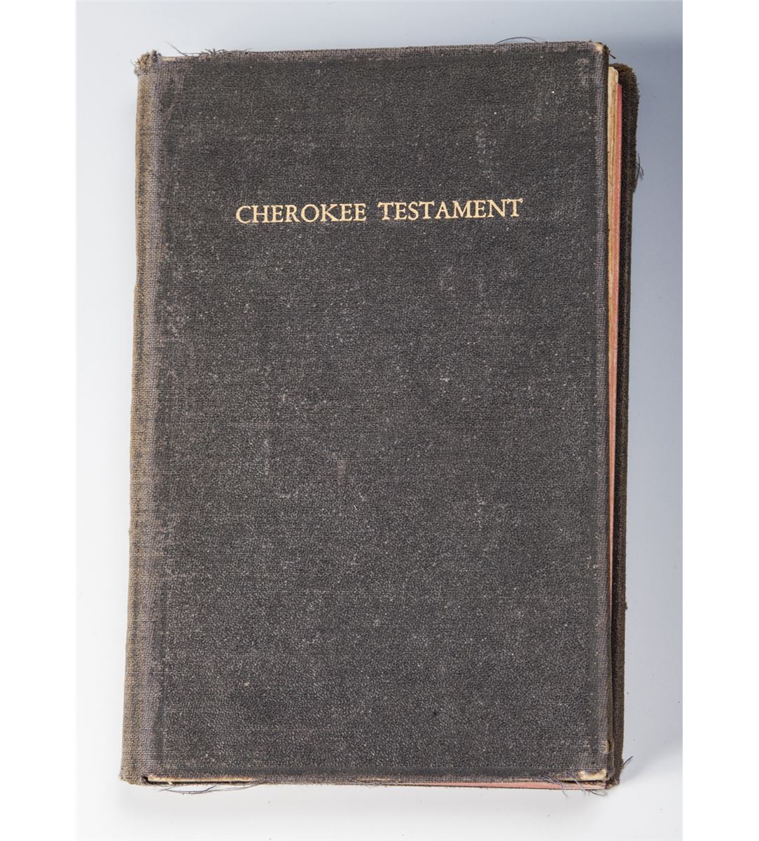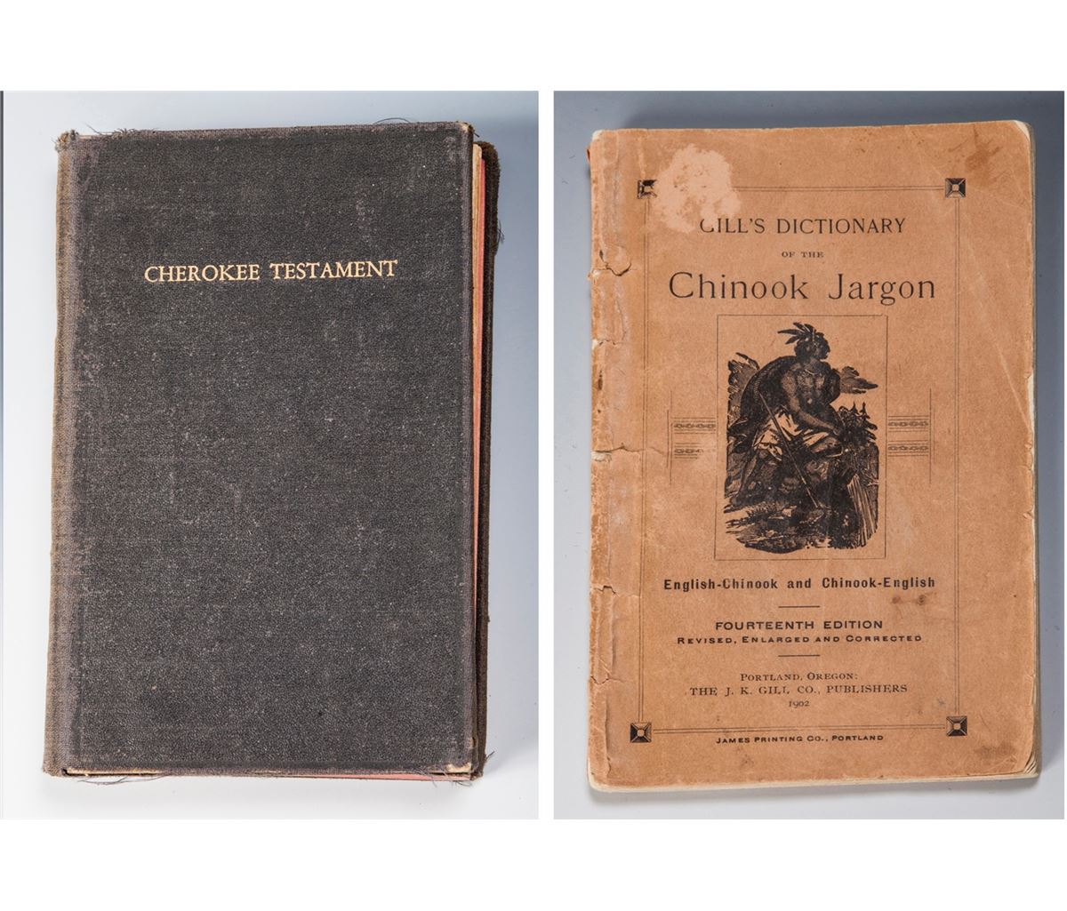 Cloth bound "Cherokee Testament", 408 pages, worn edges, printed in the Cherokee language with alphabet included, circa 1951. 7” x 4 ½", loose binding. Accompanied by, “Gill's Dictionary of the Chinook Jargon”, 14th edition 1902. The guide for traders and travelers. 64 pages, 5 ½" x 3 ½" paper covers, chipped, worn. Chinook Jargon was a trade language that was used extensively in the nineteenth century and first part of the twentieth century for communication between Europeans and First Nations people in much of the Pacific Northwest, including British Columbia.