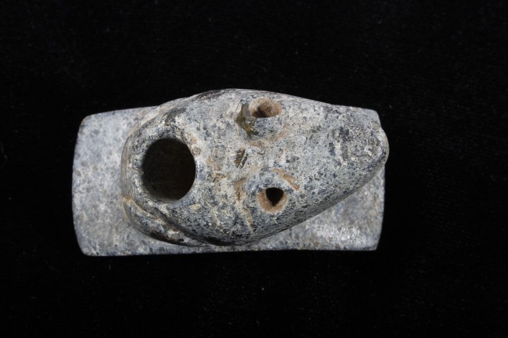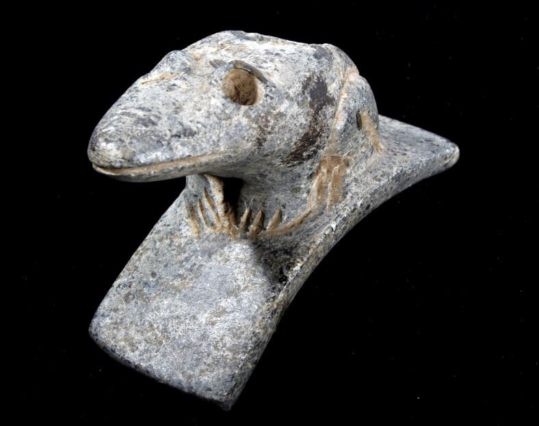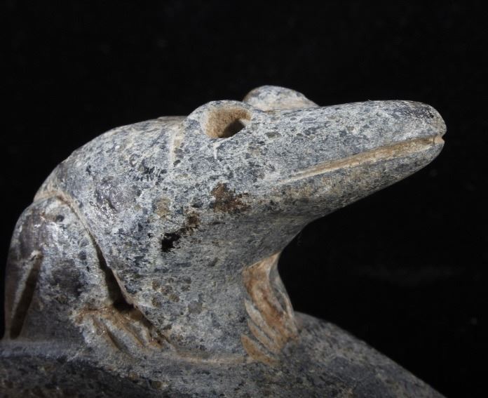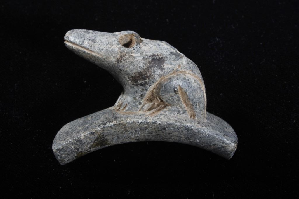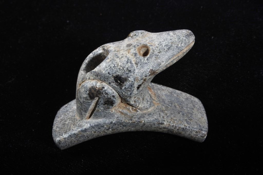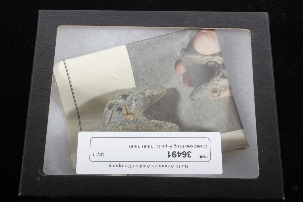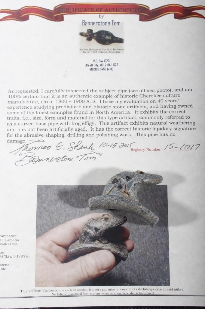 This is an authentic Cherokee Native American culture Frog Effigy pipe from circa 1800-1900 A.D. The piece shows a wonderful grey/blue steatite material. The pipe comes with a Certificate of Authenticity from Bannerstone Tom and is truly a rare piece. Provenance: from the Stoller Collection in North Carolina. The piece shows an arch hopewell like design with carved frog effigy along the top and is truly a museum quality piece. Measures 2 3/8"L x 1 1/8"W x 1.75"H. This comes in a glass top shadow box that is 5.25"x6.25" and 1 3/8" thick. Inside the box is an early tag that reads, "Historic Period Steatite Frog Pipe. Cherokee. N. Carolina."