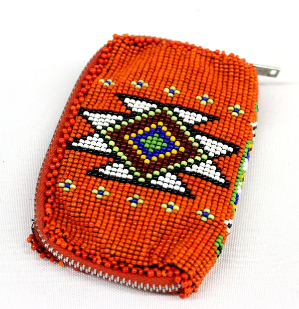 Cherokee Fully Beaded Change Purse. Beautiful workmanship in this beaded change purse with a zipper around 3 sides. There are a few beads missing on the edge but does not distract. Indian symbols with man and woman. Measures 3 3/4'' x 2 1/2''.