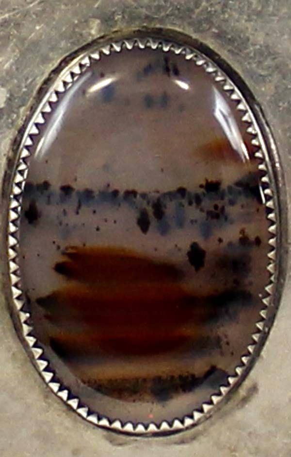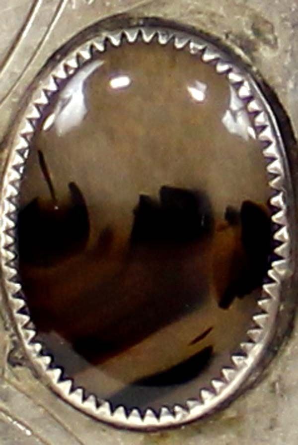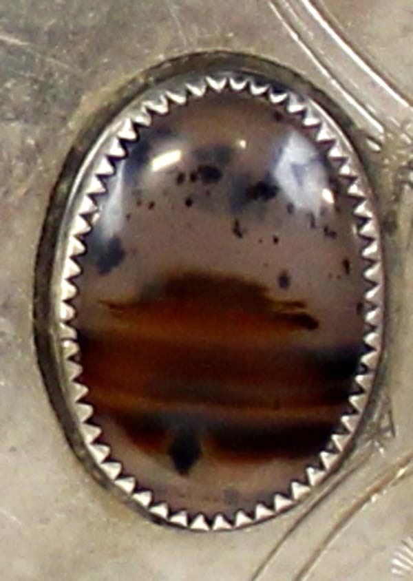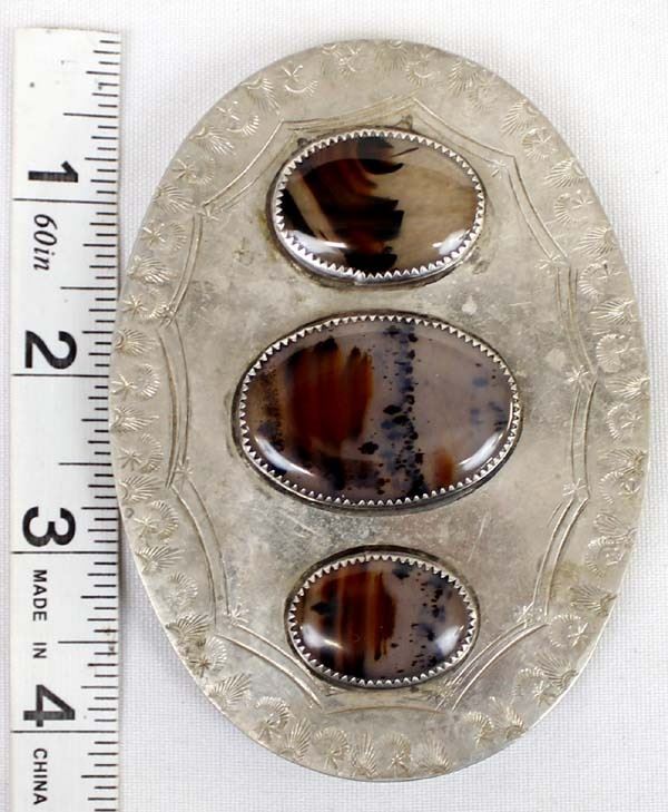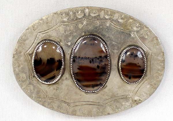 Native American Cherokee German Silver and Moss Agate Buckle, measures 4''L x 3'', engraved on the back ''By Chairakee Ind. N.W.''