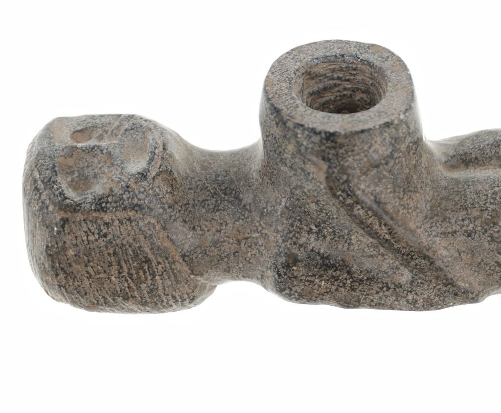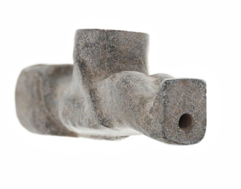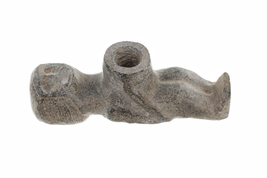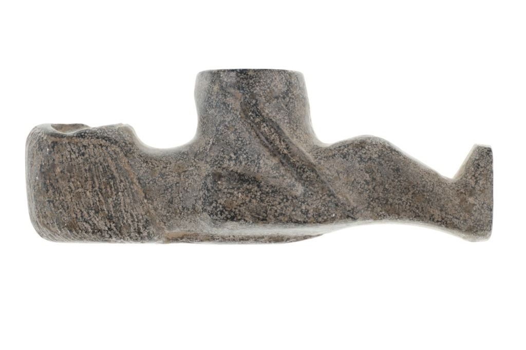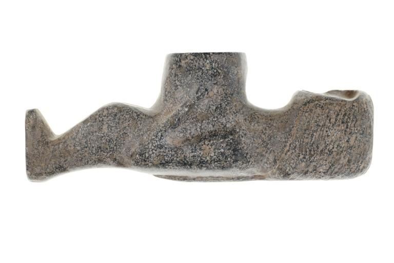 For your consideration is this hand carved human effigy stone pipe from the Cherokee Tribe circa late 1800s, found in the state of Tennessee. This pipe shows an effigy of a human carved from stone with the bowl sitting over the belly of the effigy. The condition of this carved effigy pipe is good with no obvious signs of damage and shows good overall condition. The measurements of this pipe are 7 3/8" L x 2 1/8" W x 2 7/8" H and weighs 2 pounds and 2 ounces.