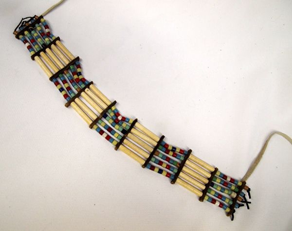 Native American Cherokee Hare Bone Choker. Strung on leather with colorful pony bead accents. Measures 26 1/2'' 1 1/4''.