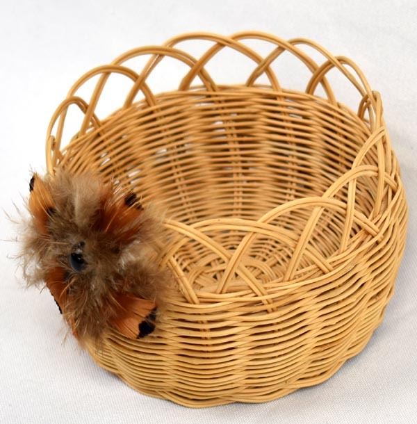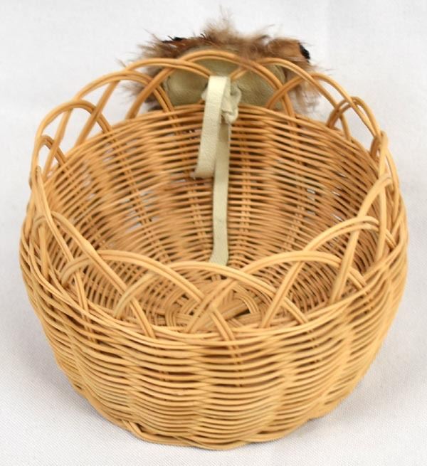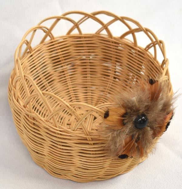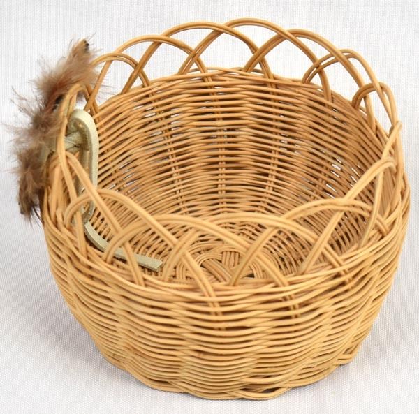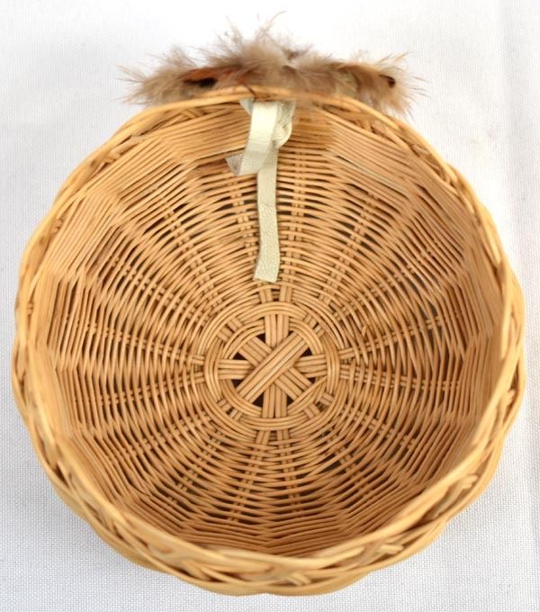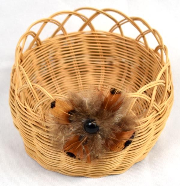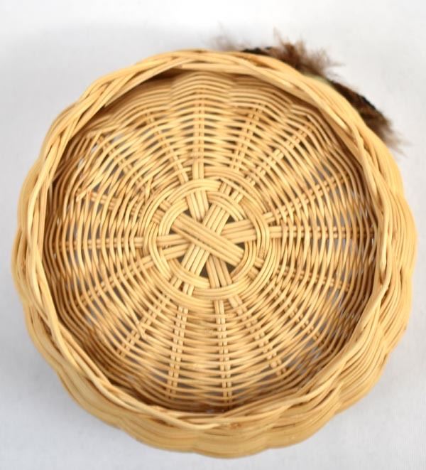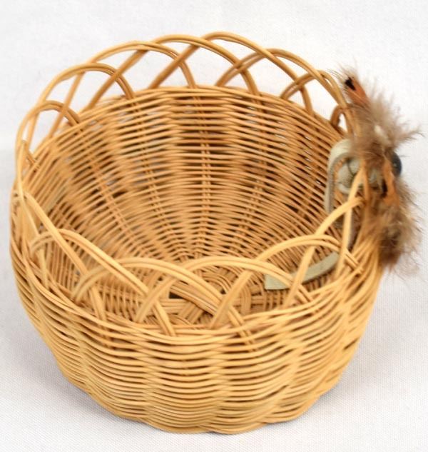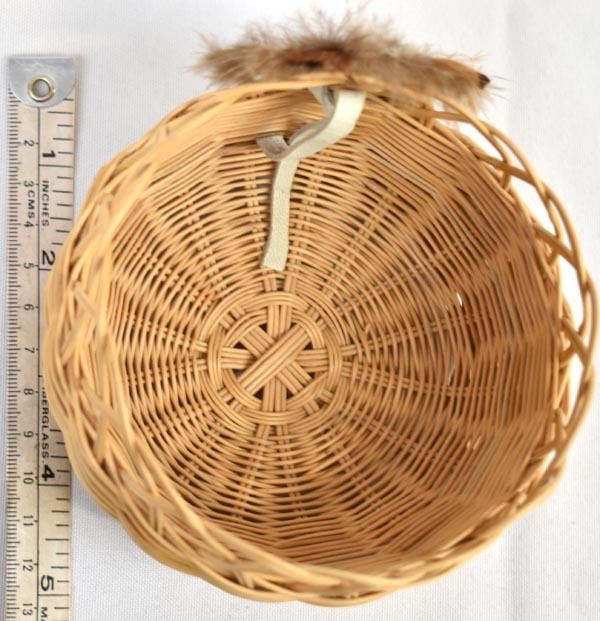 Native American Cherokee Honeysuckle Vine Basket by Waleah Vivian Waytula, measures 3'' x 4'' and is embellished with feathers and cabochon
