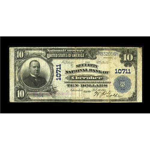 <B>Cherokee, IA</B></I> - $10 1902 Plain Back Fr. 631 <B>The Security NB</B></I> Ch. # 10711<BR>This <B>Fine</B></I> note is one of just six $10 Plain Backs traced from this issuer. We do note a small repaired margin chink at bottom. This institution was in business for just 15 years, failing in 1930.<BR><BR><b>Shipping:</b> Coin/Currency (<a target="_blank" href="http://www.heritageauctions.com/common/shipping.php">view shipping information</a>)