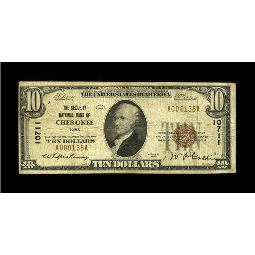 <B>Cherokee, IA</B></I> - $10 1929 Ty. 1 <B>The Security NB</B></I> Ch. # 10711<BR>This locale had two issuers, with this being the scarcer by a small margin. Tonight's <B>Fine</B></I> example is likely to sell in the range of...<BR><BR><b>Shipping:</b> Coin/Currency (<a target="_blank" href="http://www.heritageauctions.com/common/shipping.php">view shipping information</a>)