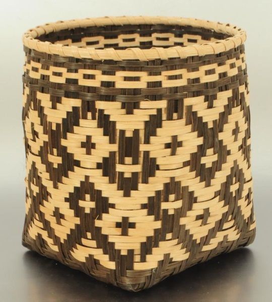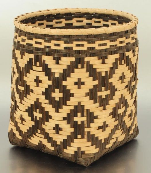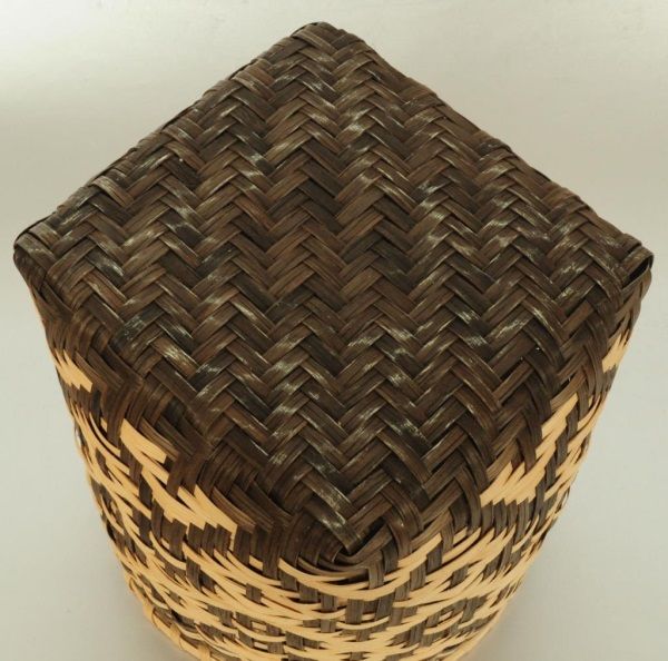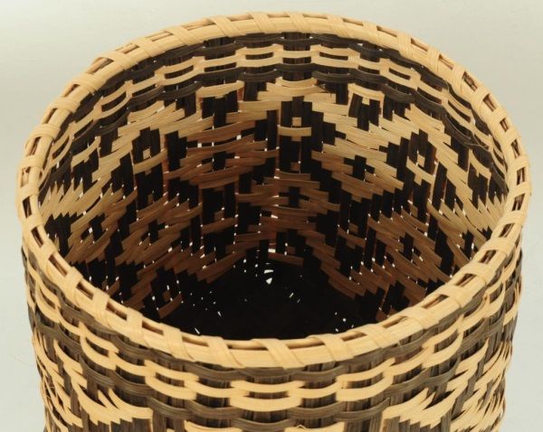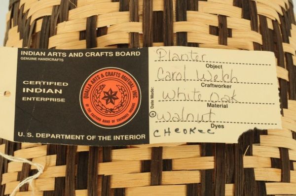 8" W x 8-3/4" H. Certified by the Department of Interior as White oak planter basket woven by Carol Welch of the Cherokee Tribe