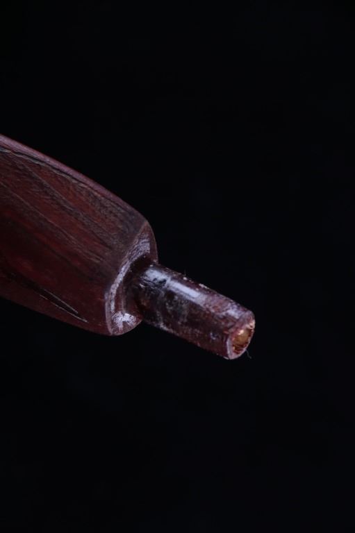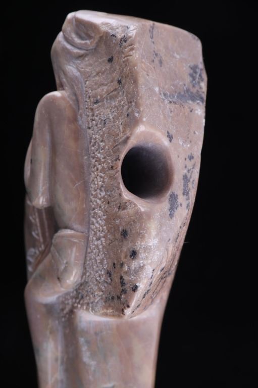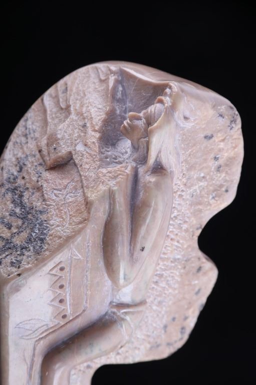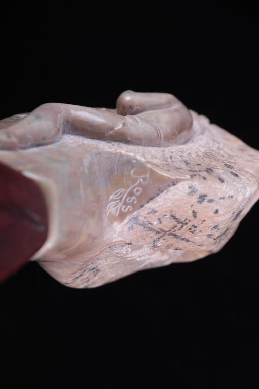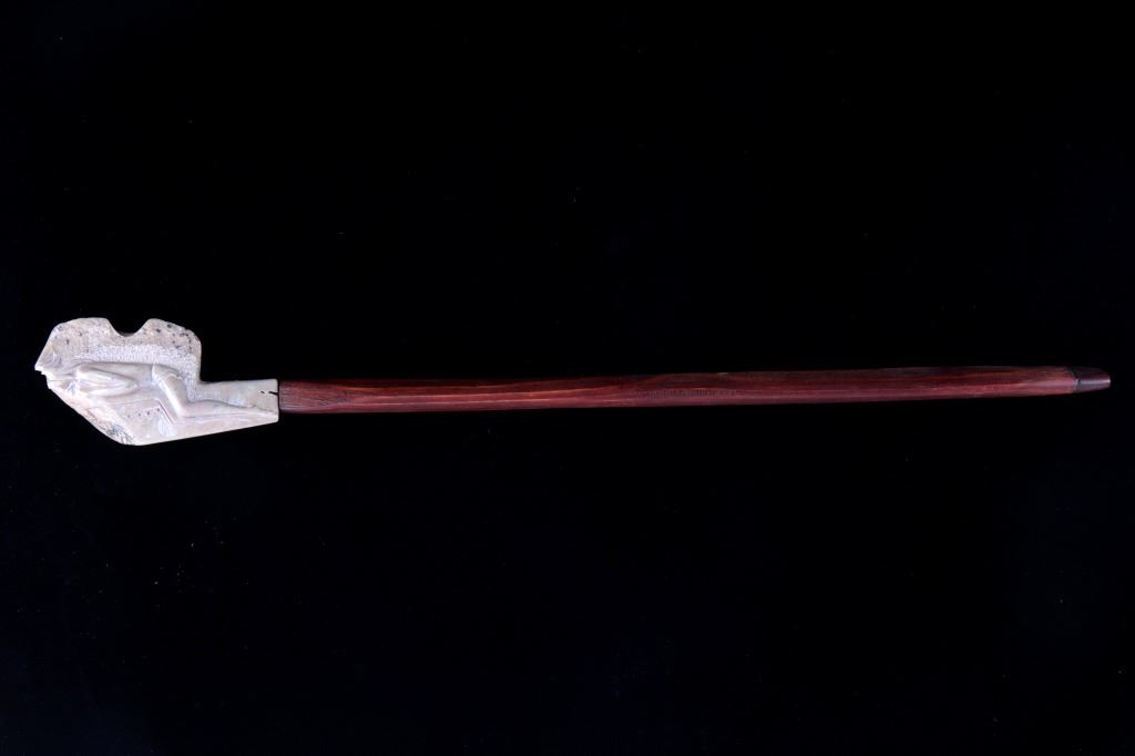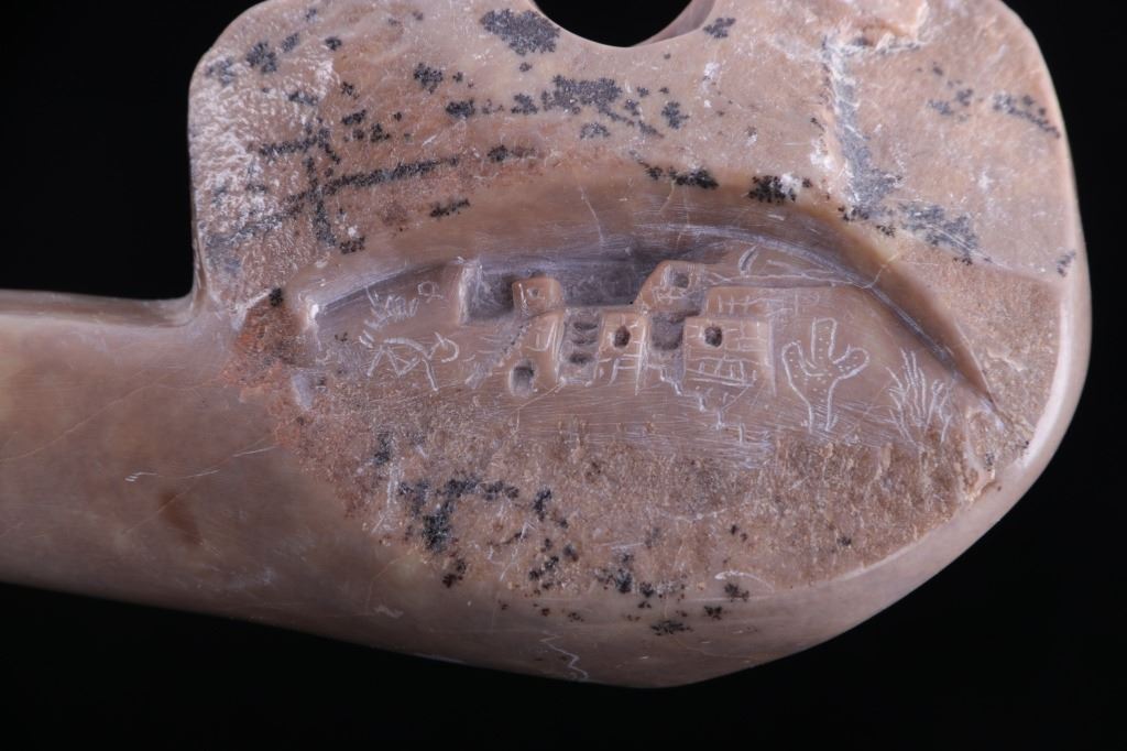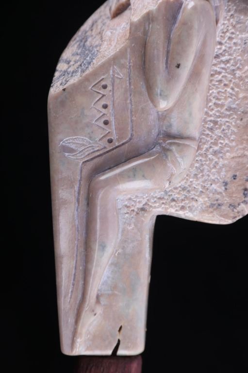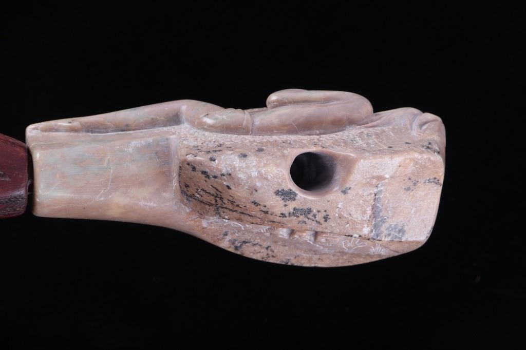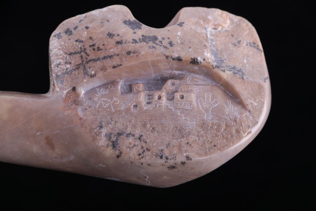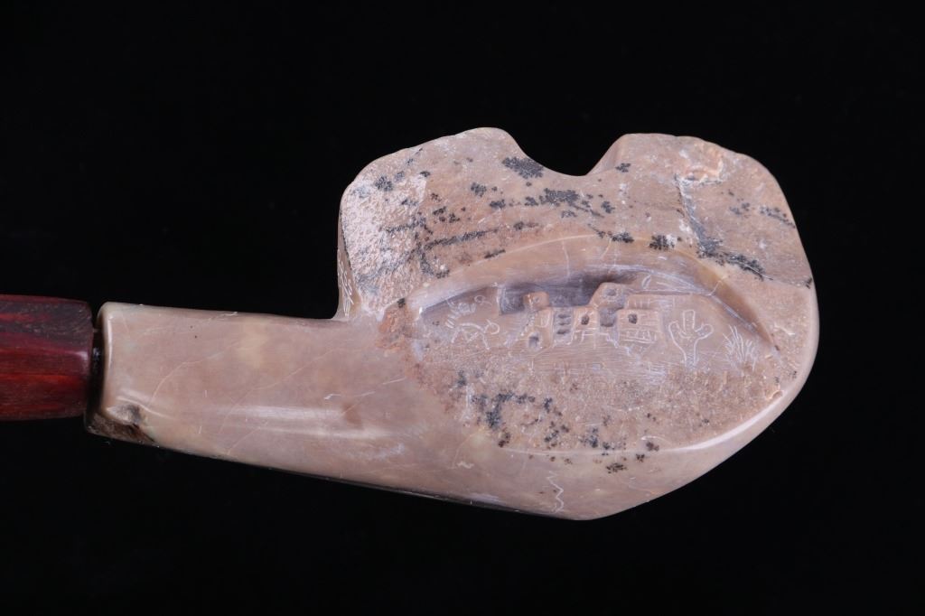 Featured in this lot is this Dendretic storyteller pipe attributed to and signed by the Cherokee Indian maker, Ross. The pipe features a wonderfully and professionally crafted hardwood pipe stem with a pipe bowl featuring a figure lying down on their belly in a cliff side with traditional decorations on the other side of the pipe bowl; this section is polished and the other side of the pipe bowl is rough cut. The condition of this pipe is good, with no obvious signs of damage. The measurements of this pipe are 23" x 1 7/8" x 3".