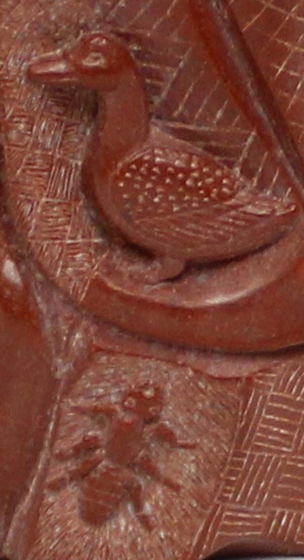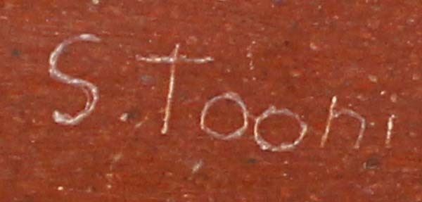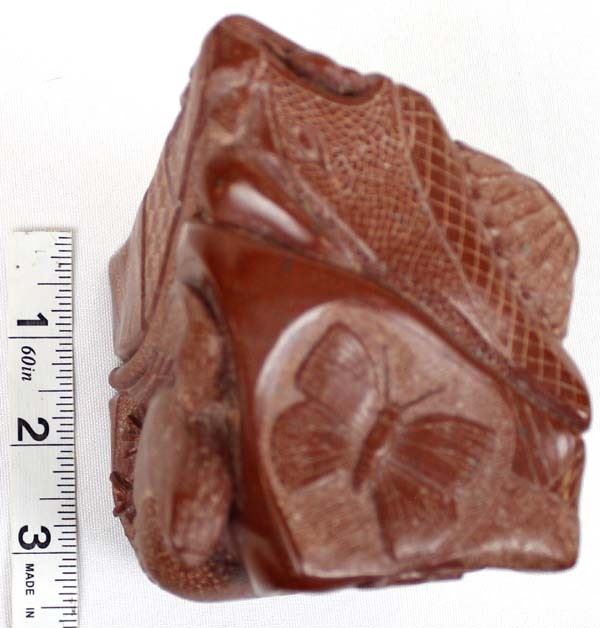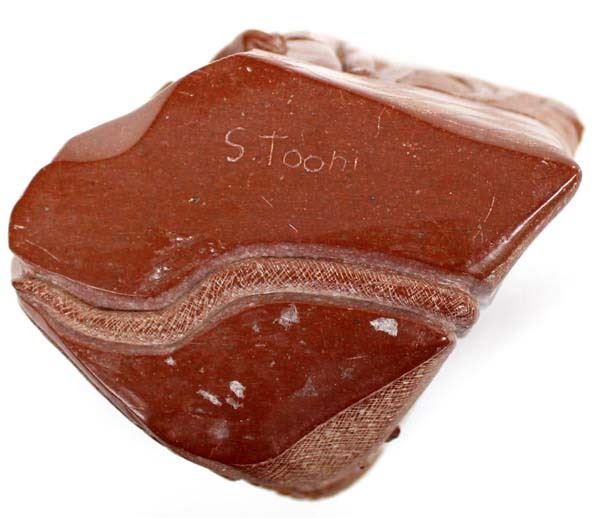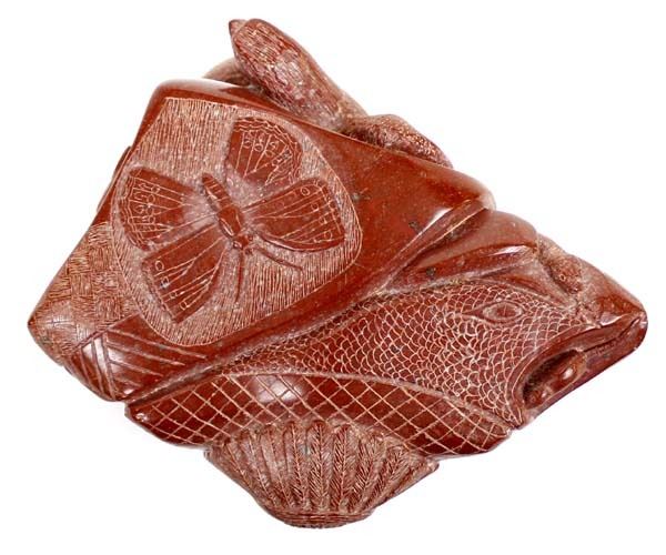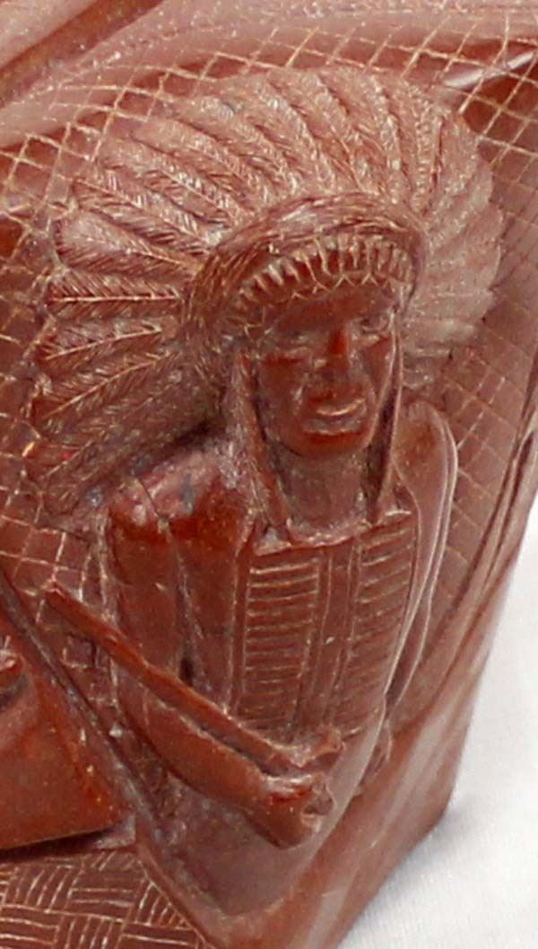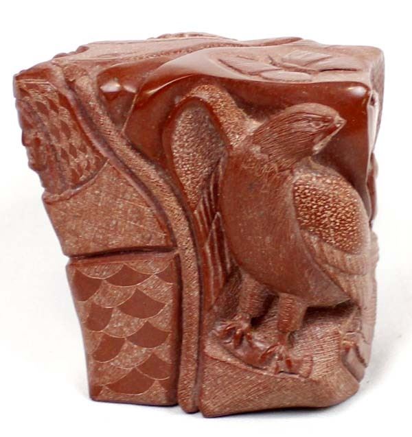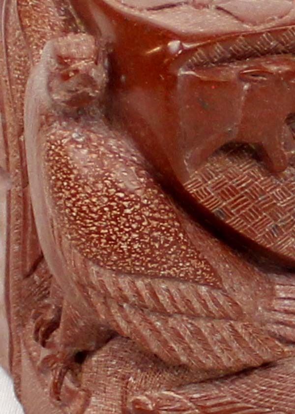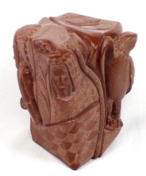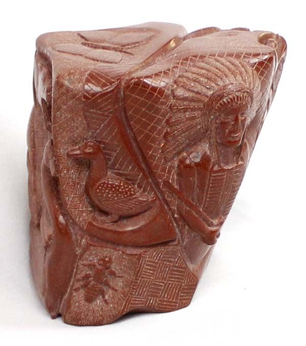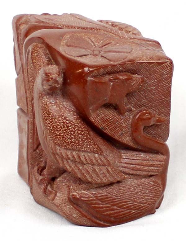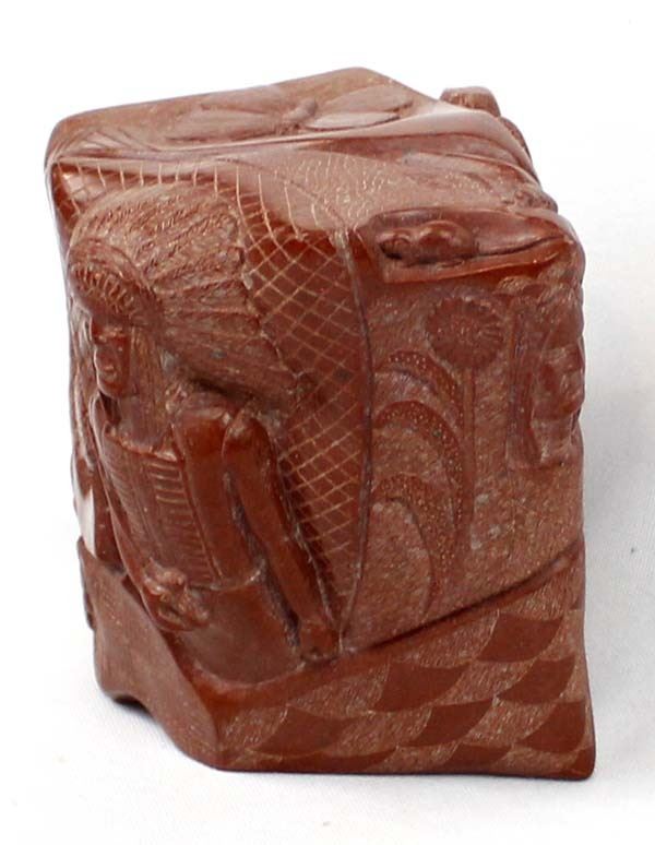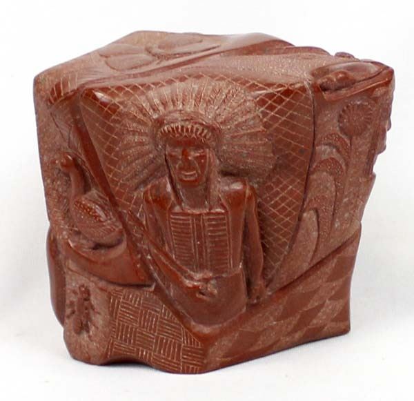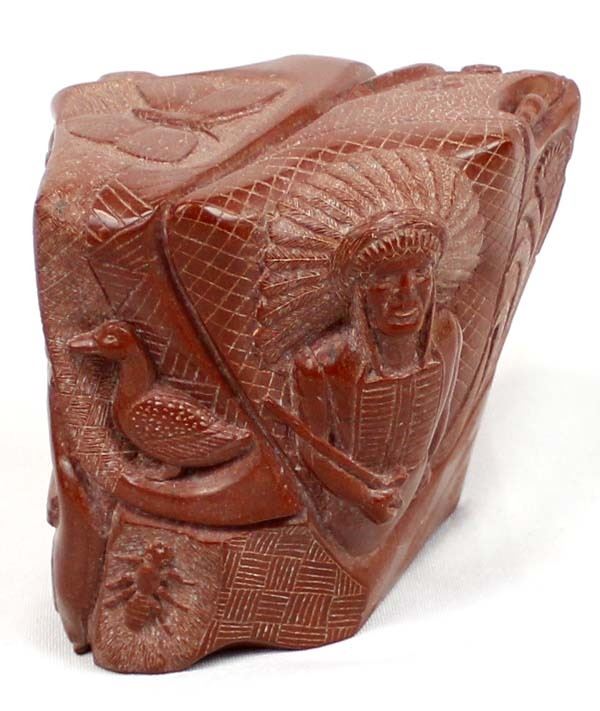 Qualla Cherokee Intricately Carved Catlinite Sculpture by Stan Tooni, Jr. a North Carolina Cherokee Tribal member, measures 4''H x 5''W and is signed on the bottom, carving includes Native American, Snake, Eagle, Mouse, Sunflower, Chief, Bug, Duck, Butterfly, Swan, Hog, and Hawk, FYI: ''I watched my father do woodworking, but I mostly taught myself how to carve. I do a lot of figures associated with Cherokee history like Sequoyah, Eagle Dancers and totems. I like to do my carving late at night when things are quiet.''