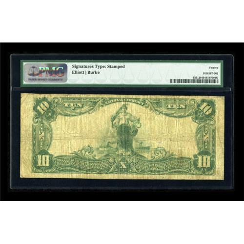 <B>Cherokee, KS</B></I> - $10 1902 Plain Back Fr. 633 <B>The First NB</B></I> Ch. # 5447<BR> Very desirable in large size as this serial number 3000 example becomes only the fourth reported for this bank. A very collectible Native American town name should generate much bidder interest as it has been over seven years since a large $10 has been offered from here. <B>PMG Fine 12.</B></I><BR><BR><b>Shipping:</b> Coins & Currency (<a target="_blank" href="http://www.heritageauctions.com/common/shipping.php">view shipping information</a>)
