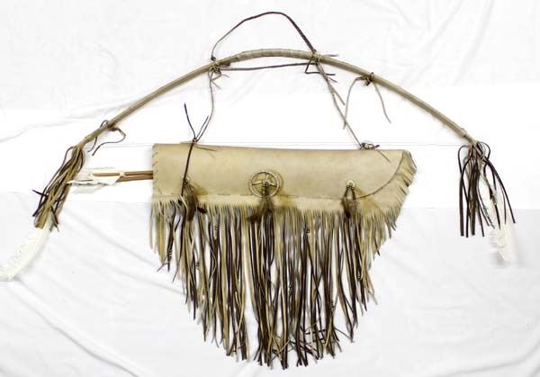 Native American Cherokee Leather Wrapped Bow, Arrows, and Quiver, bow measures 42''L, arrows measure 34''L, embellished with feathers, fringed leather, brass and antler beads, the decorative arrows have wood points and feather fletching, beautiful piece of art