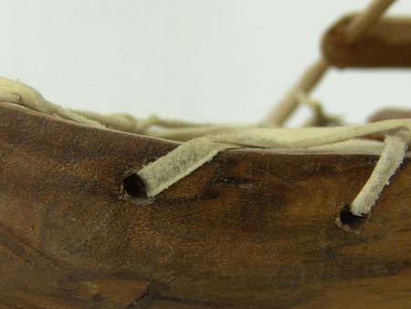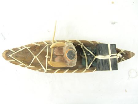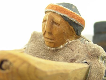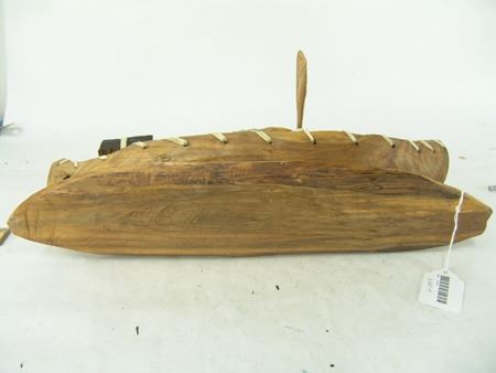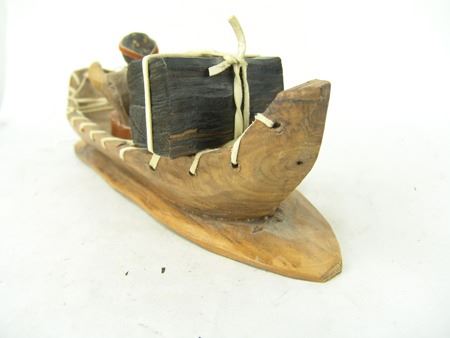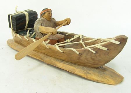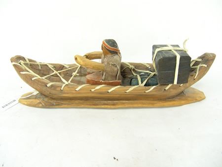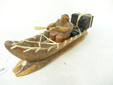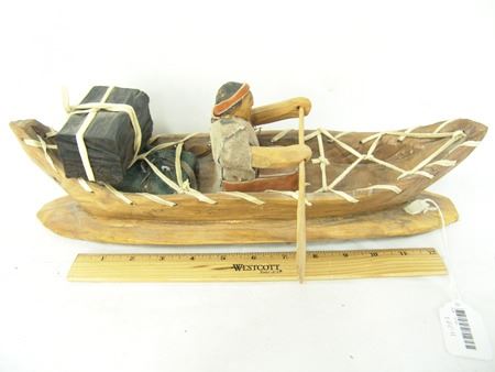 Early/Mid 1900s, Unique hand carved wooden "transport" canoe and base containing a clothed paddler and two-piece cargo. Good condition. 5-1/2" x 17" x 7-1/4"