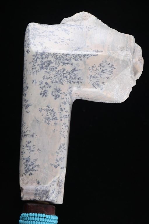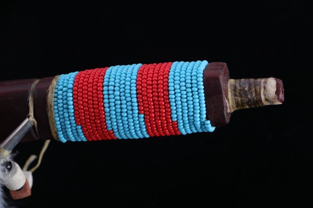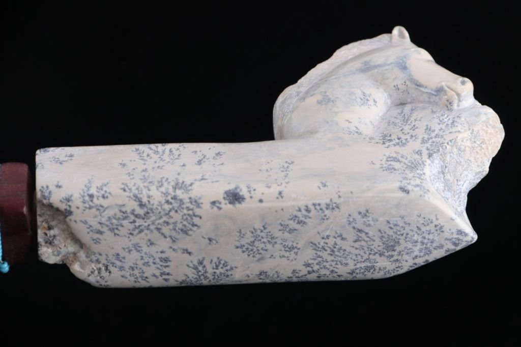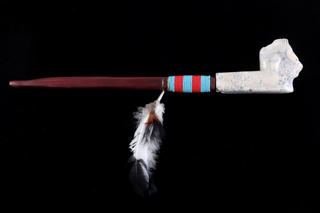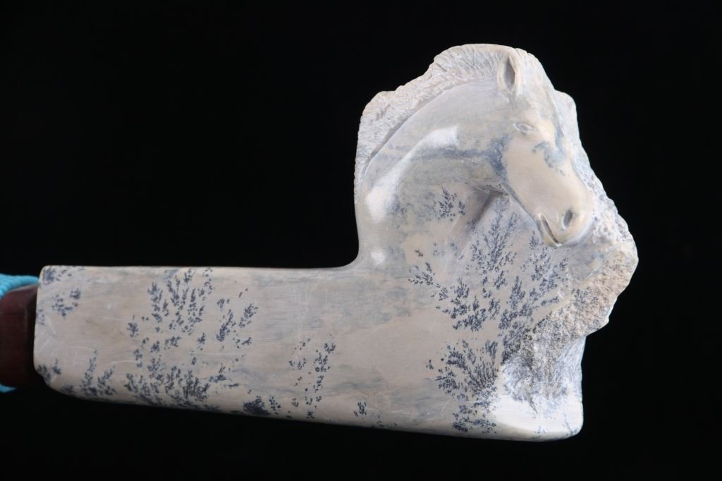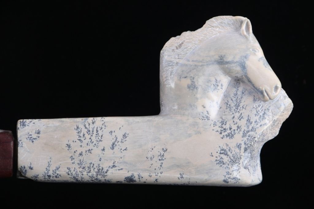 Featured in this lot is this pipe and bowl made from dendretic talc in the shape of a horse head and attributed to a Cherokee Indian artist, Ross. The pipe shows wonderfully and professionally crafted design with trade seed bead decorations in colors of sky blue and medium red. The coloration of the Dendretic talc bowl shows the iconic colors with flecks mineral deposits throughout. The condition of this pipe is good, with no obvious signs of damage. The measurements of this pipe are 17 3/4" x 1 1/2" x 3 1/4".
