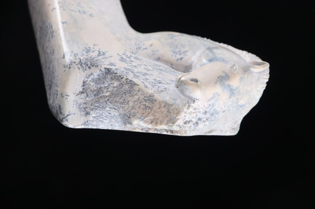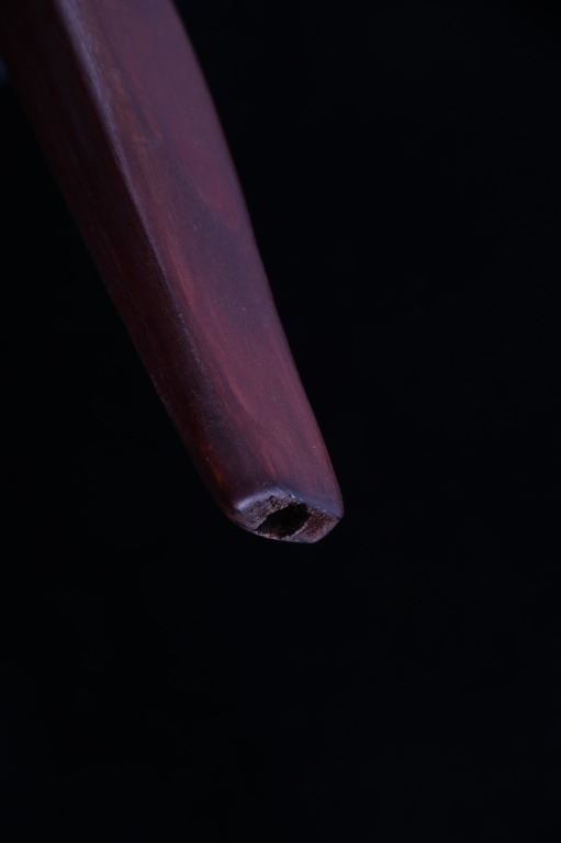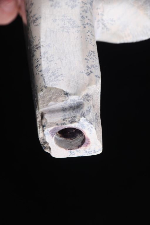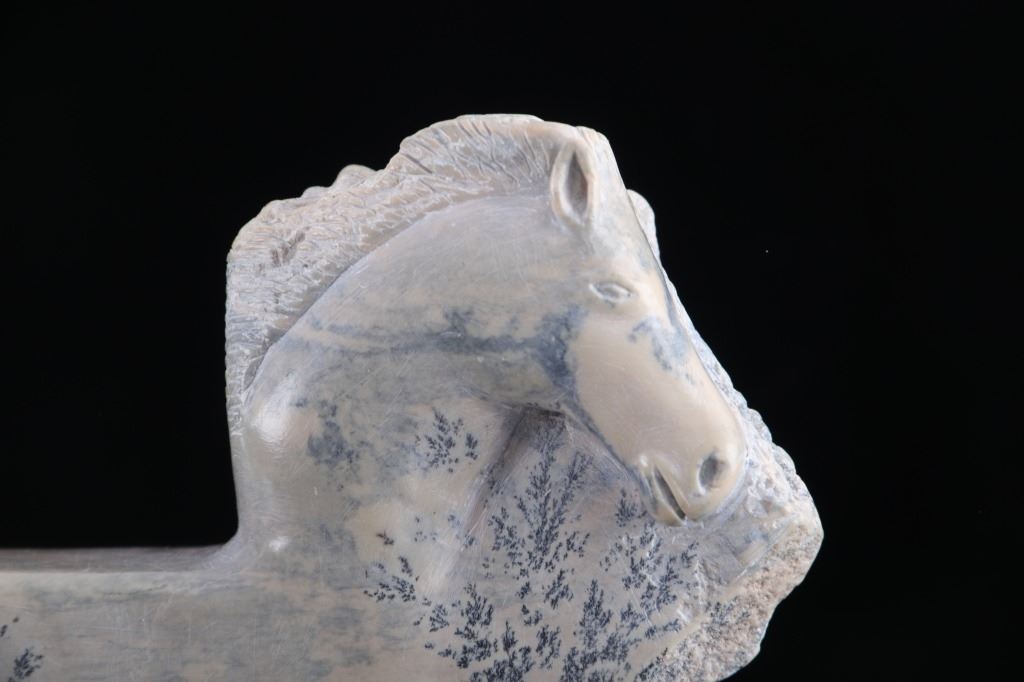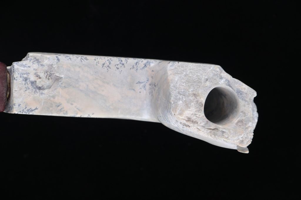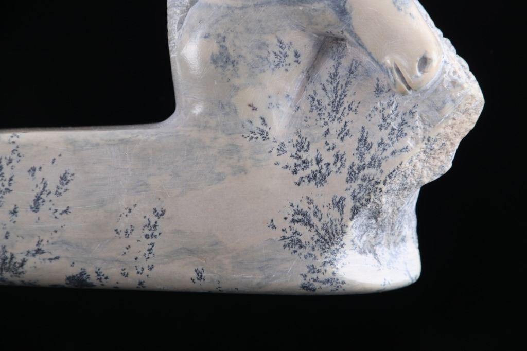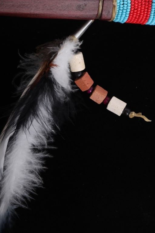 Featured in this lot is this pipe and bowl made from dendretic talc in the shape of a horse head and attributed to a Cherokee Indian artist, Ross. The pipe shows wonderfully and professionally crafted design with trade seed bead decorations in colors of sky blue and medium red. The coloration of the Dendretic talc bowl shows the iconic colors with flecks mineral deposits throughout. The condition of this pipe is good, with no obvious signs of damage. The measurements of this pipe are 17 3/4" x 1 1/2" x 3 1/4".