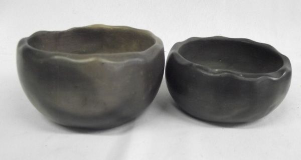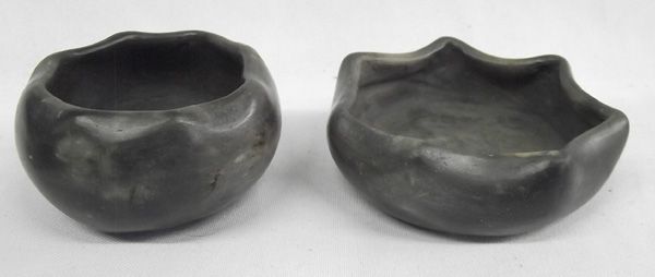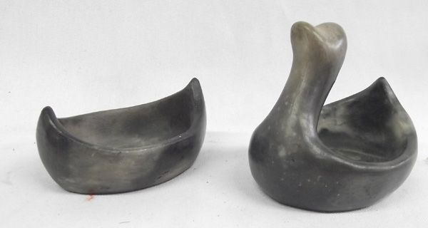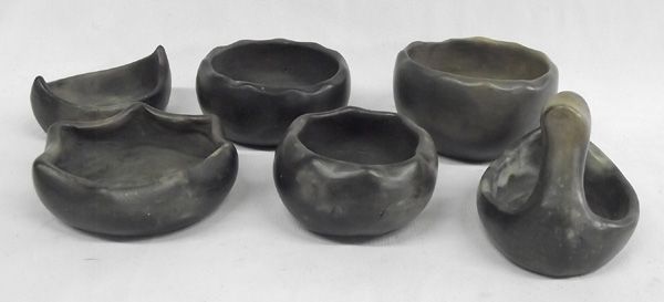 6 Cherokee Pottery Bowls. Great group of small pottery, one in the shape of a duck and one shaped like a canoe. Similar color and burnishing on all. The largest round bowl measures 3.75''W x 2''H.