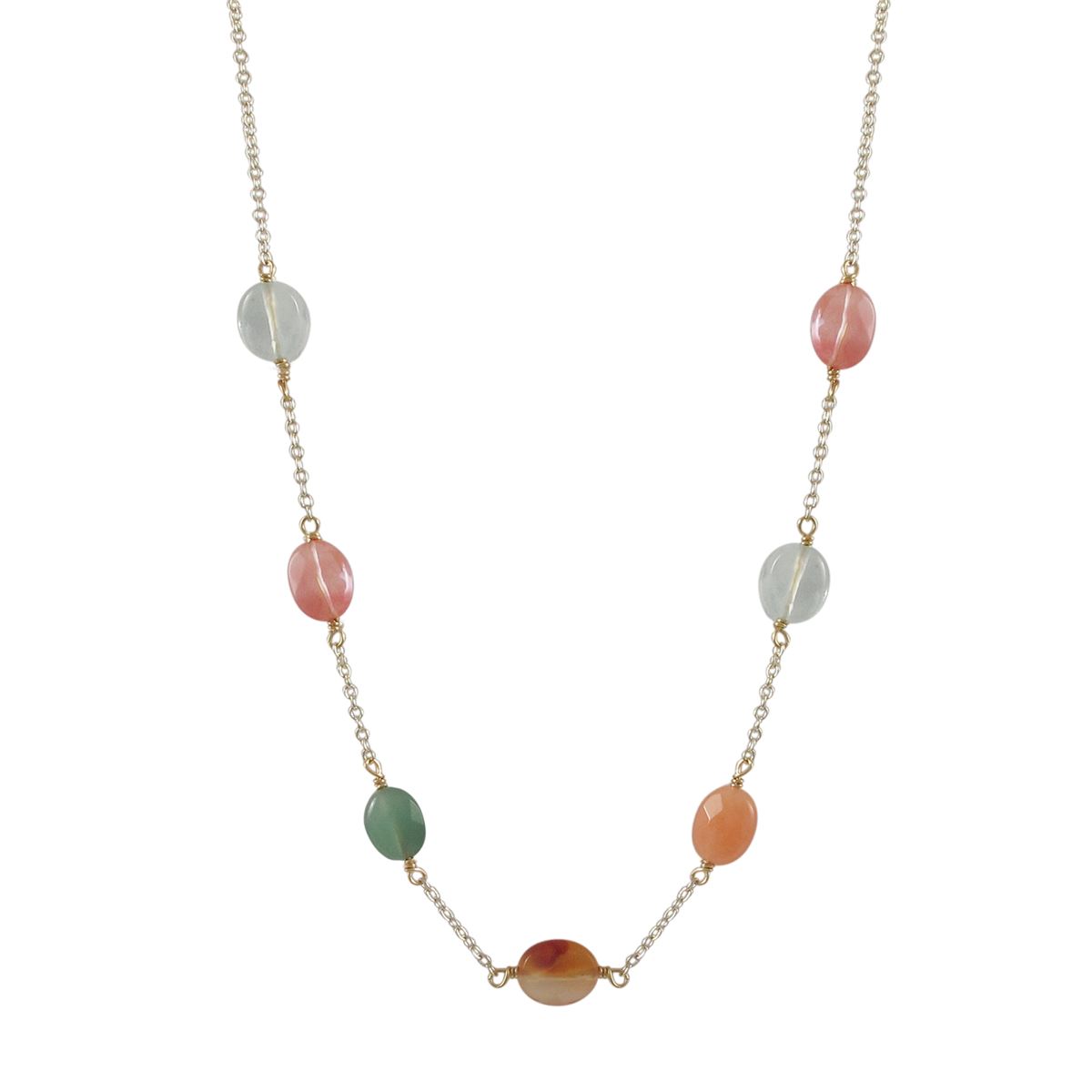 Cherry And Aqua Combination Of Semi Precious Stones On Gold Plated Sterling Silver Chain Necklace, 16" 2"
