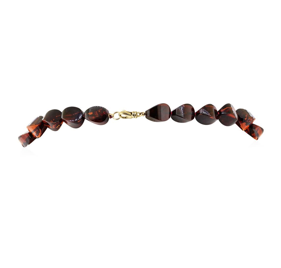 One necklace measuring approximately twenty-seven and a half inches in length featuring: straight side oval beads of Baltic amber measuring between 12 and 17mm in diameter and a 14KT yellow gold clasp, with a total weight of 81.7 grams