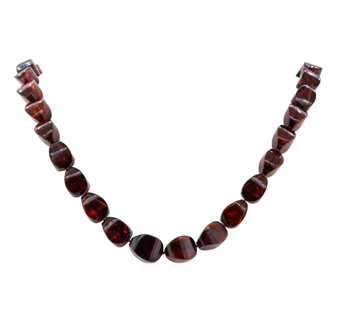 One necklace measuring approximately twenty-seven and a half inches in length featuring: straight side oval beads of Baltic amber measuring between 12 and 17mm in diameter and a 14KT yellow gold clasp, with a total weight of 81.7 grams