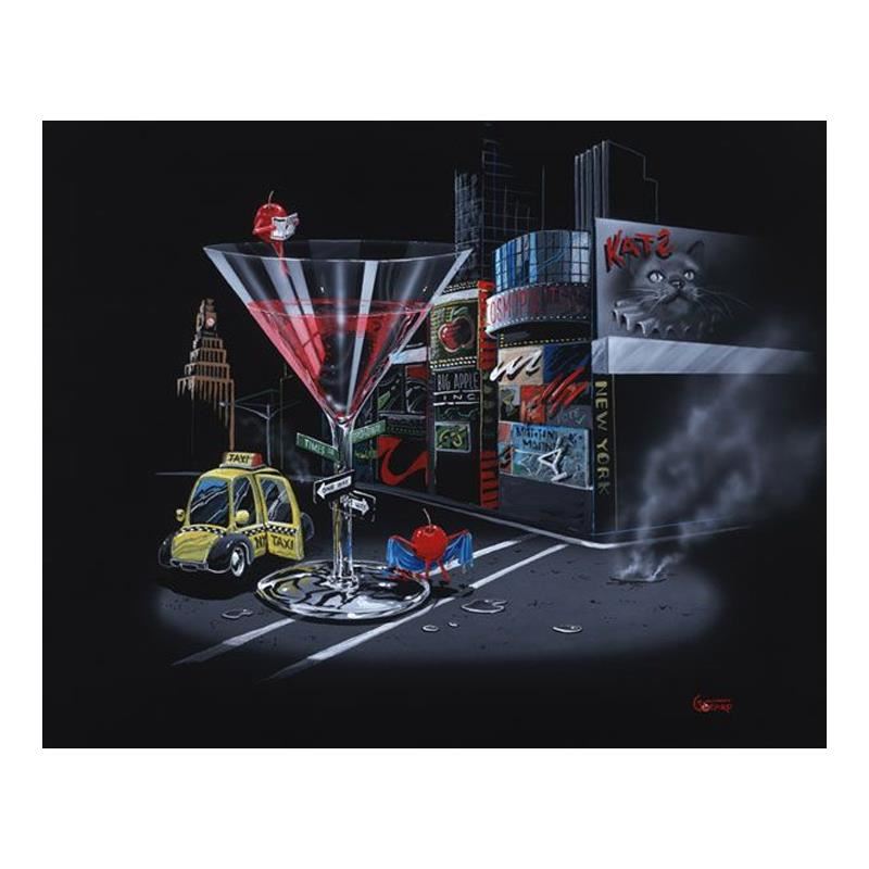 "Cherry Cosmo II" is a numbered limited edition giclee on canvas, from a sold out edition, by Michael Godard bearing the artist's authorized signature. This piece is gallery wrapped and includes a Certificate of Authenticity. Measures approximately: 28" x 35".