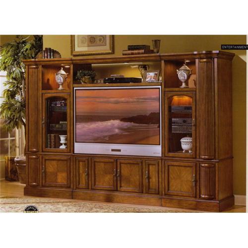 It features bold 6? fluted functional pilasters complete with media storage and versatile sized TV opening combined with glass door pier cabinets.