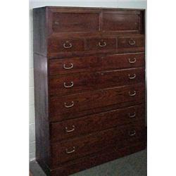 Cherry Japanese Tansu, C.1950, rectangular form, two sliding glass doors over three short drawers, over five graduated long drawers, measures approximately 66" high x 45" across x 16 3/4" deep