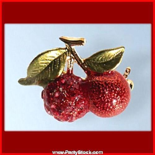 Cherry Pin Brooch is set with lots of genuine, sparkling Gold Swarovski Crystals<BR><BR>Each of these items is meticulously crafted from fine pewter. Then, most are embellished or coated in solid 24 Karat Gold. Finally, the piece is hand enameled and lavishly inlaid with genuine Swarovski crystals by skilled artisans. Many of our collectibles are lined in velvet or fitted with ring inserts to make a most splendid jewelry presentation. All pieces are finished on the inside with a sparkling, swirled enamel. Our collection adds the definitive touch to any gift-giving occasion. Also, this collection is issued in limited editions and will become a valuable keepsake to those who possess them, for years to come<BR><BR>Height: .5 Inch <BR>Width: .75 Inch
