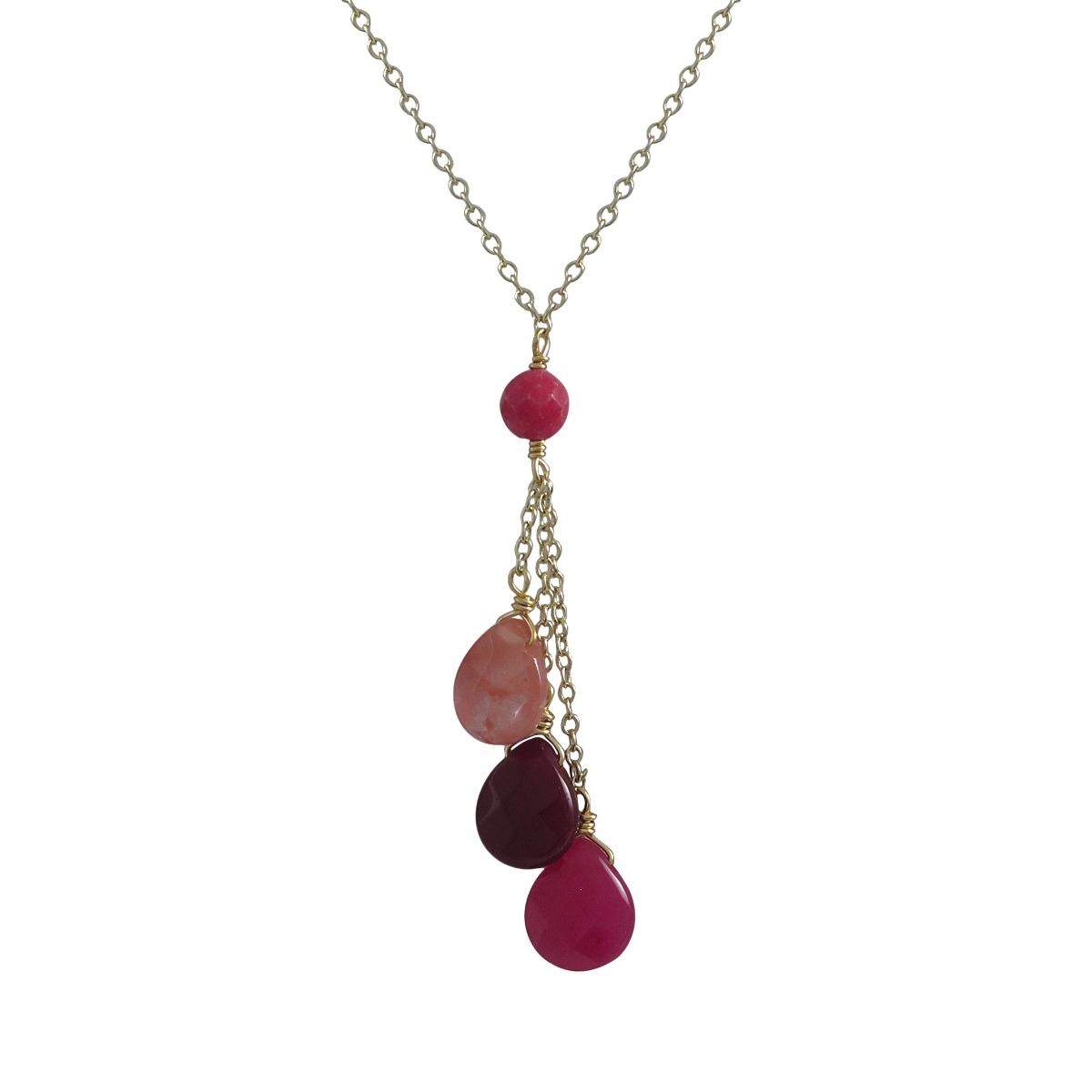Cherry Quartz And Ruby Combination Semi Precious Teardrop Stone Lariat Style Necklace, Gold Tone Brass Chain- 16" 2"