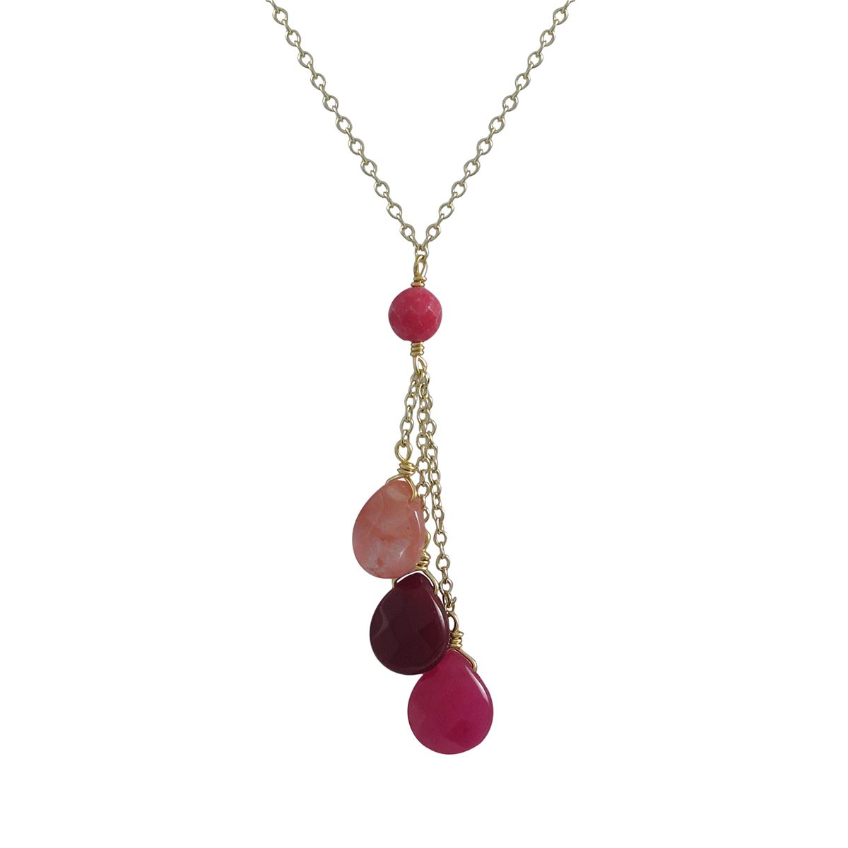 Cherry Quartz And Ruby Combination Semi Precious Teardrop Stone Lariat Style Necklace, Gold Tone Brass Chain- 16" 2"