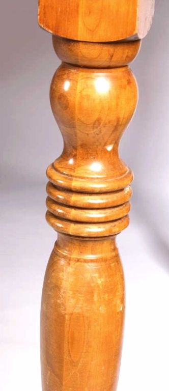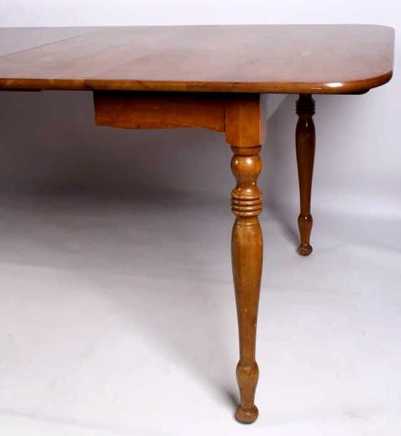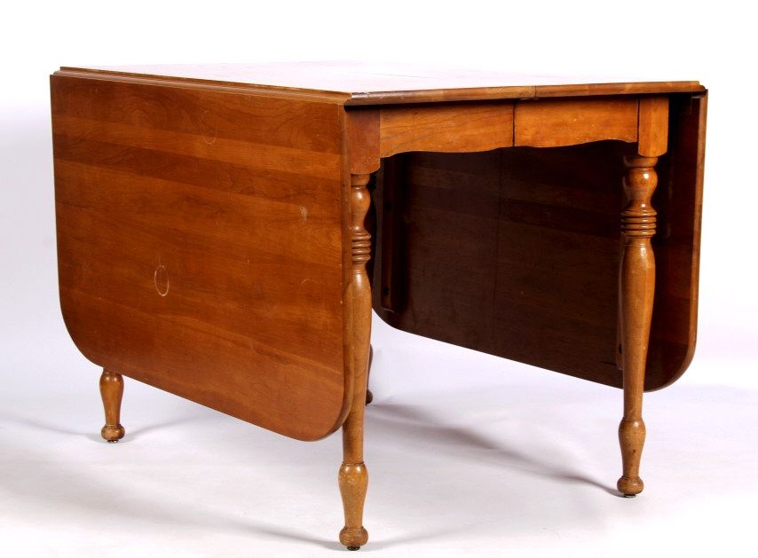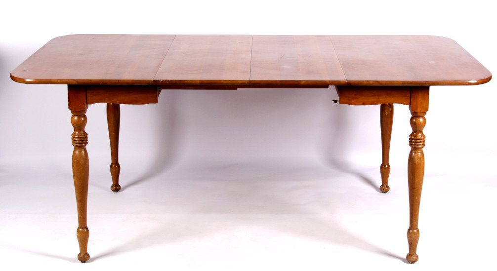 This lot features a solid cherry wood dining table. It is 7'9" x 3'6 with the leaves in. Without the leaves, it is 6'1". With the ends dropped, it is 30". It stands 30" tall.