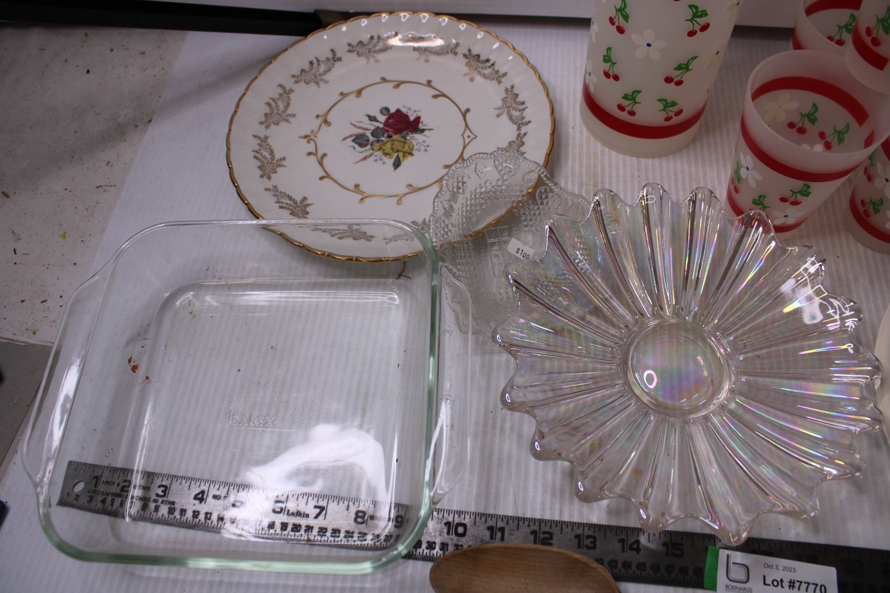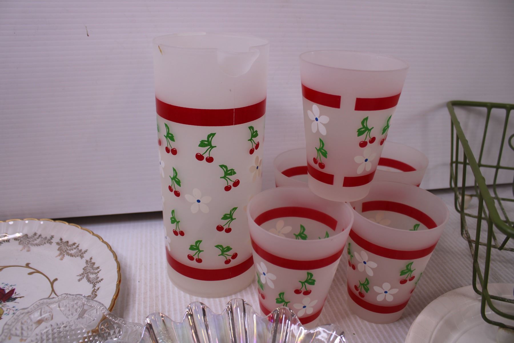 Cherry Themed Plastic Pitcher and Cup Set + Dish Rack and Misc. Glassware