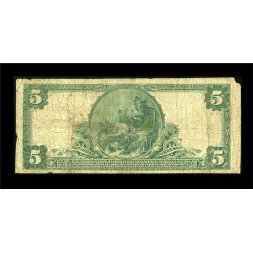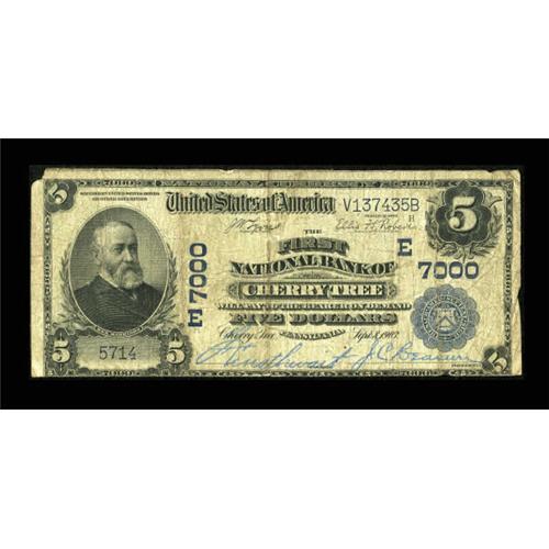 <B>Cherry Tree, PA</B></I> - $5 1902 Plain Back Fr. 598 <B>The First NB</B></I> Ch. # (E)7000<BR> A very rare large note bearing one of the great National Bank Note titles. While small examples are easy to find from this bank, this community's sole issuer, large notes can be counted on the fingers of one hand. This piece is missing a corner tip at the upper left but that is more than made up for by the vivid blue signatures and good eye appeal for the grade. Good-Very Good.<BR><I>From The Kansas City Collection.</B></I><BR><BR><b>Shipping:</b> Coins & Currency (<a target="_blank" href="http://www.heritageauctions.com/common/shipping.php">view shipping information</a>)