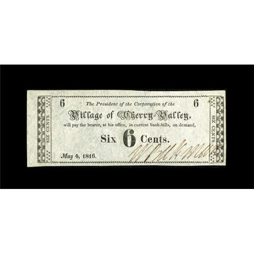 <B>Cherry Valley, NY- Village of Cherry Valley</B></I> 6¢ May 4, 1816 Harris 3<BR> A very tough early New York note listed in the Harris reference as Rarity-7. Lovely <B>About Uncirculated.</B></I><BR><I>From The Collection of a Louisiana Gentleman.</B></I><BR><BR><b>Shipping:</b> Coins & Currency (<a target="_blank" href="http://www.heritageauctions.com/common/shipping.php">view shipping information</a>)