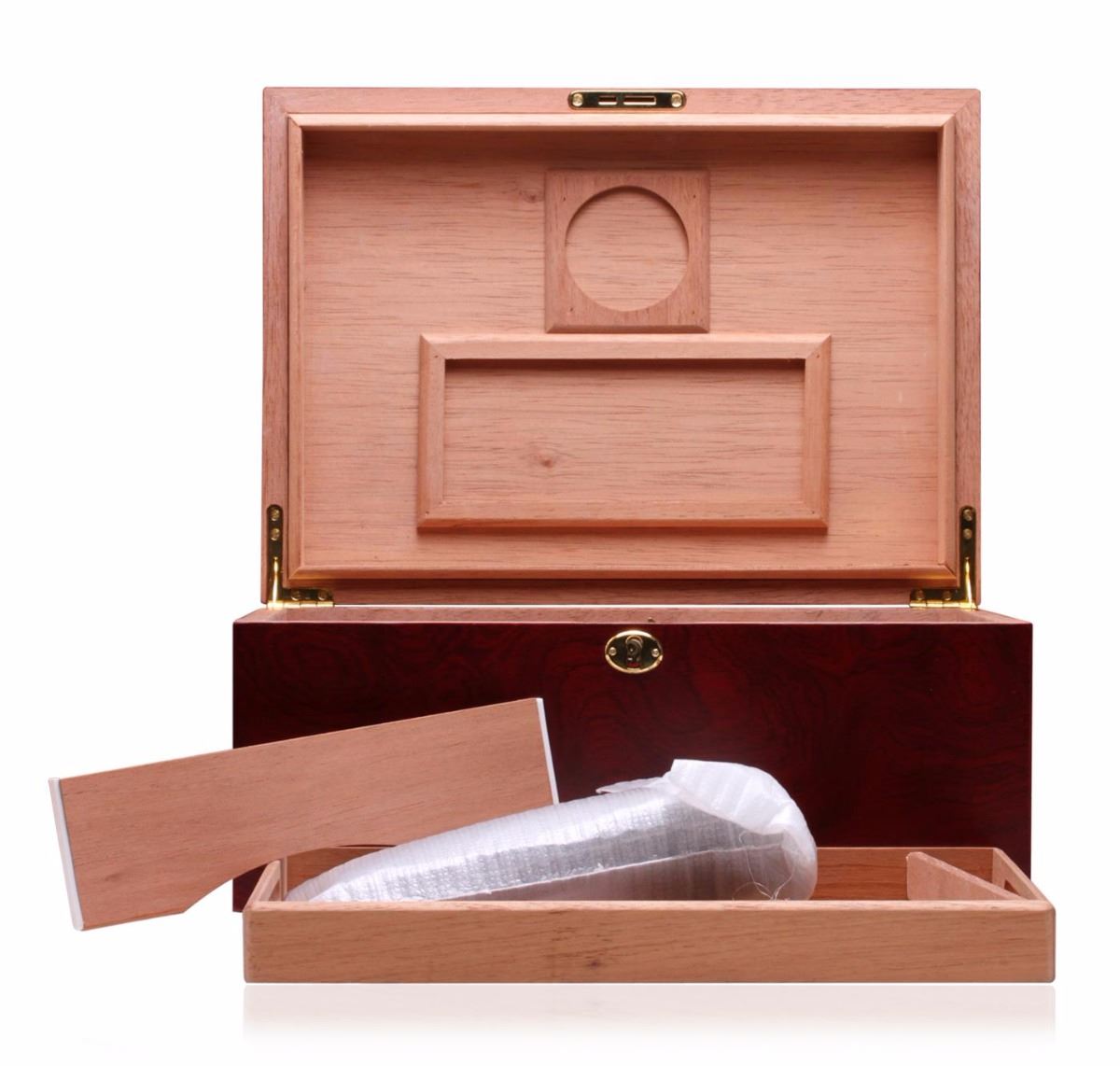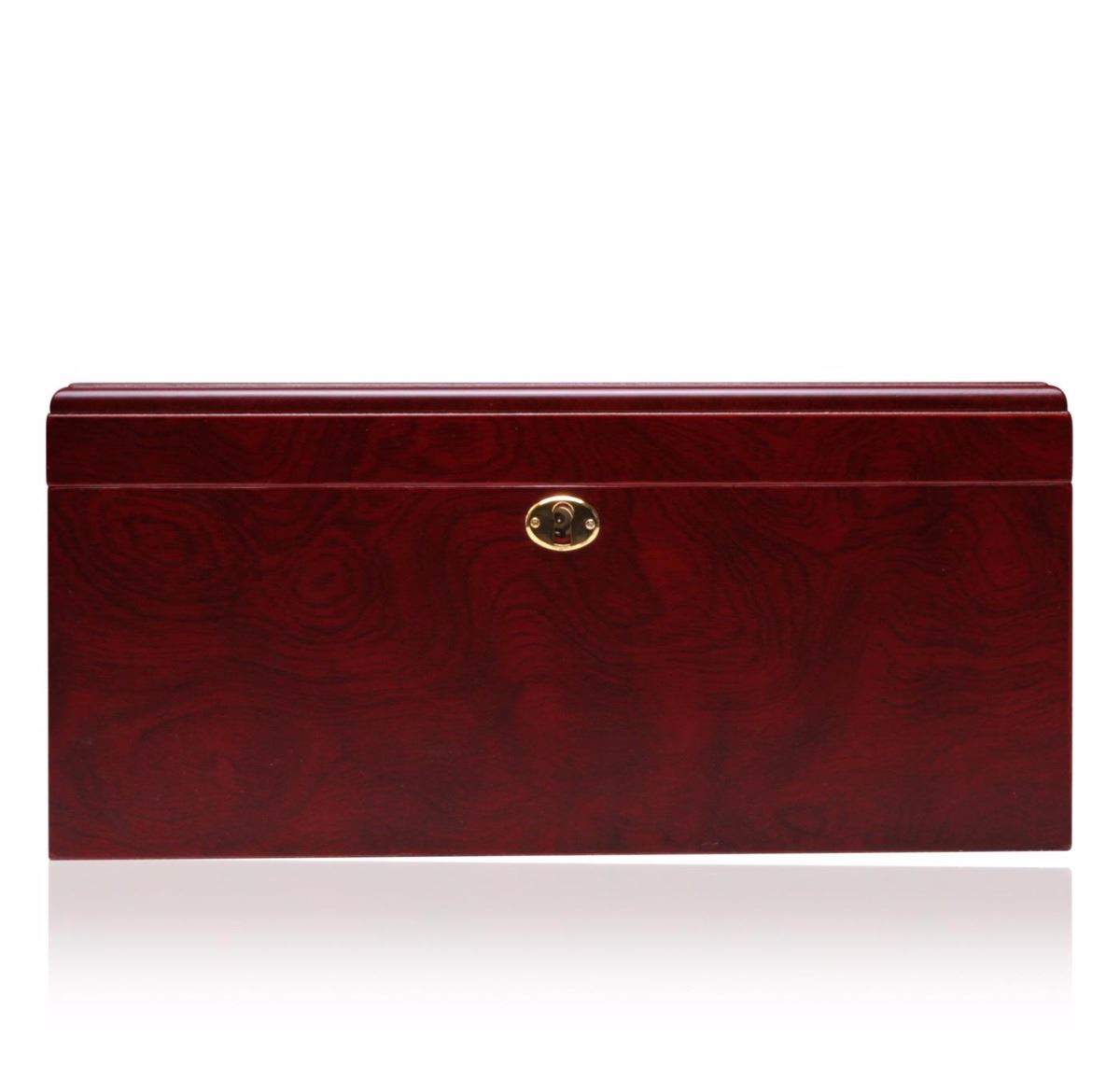 One deluxe cigar humidor featuring a glossy cherry wood exterior lined with premium Spanish cedar and solid brass hardware. Beautifully handcrafted to provide your cigars with the perfect environment for storage. This deluxe humidor will surely enhance your cigars smell and taste. Includes: Humidor, Hygrometer, Humidification System, Accessories, Instructions Manual. Measures 12 x 6 x 9.25 inches.