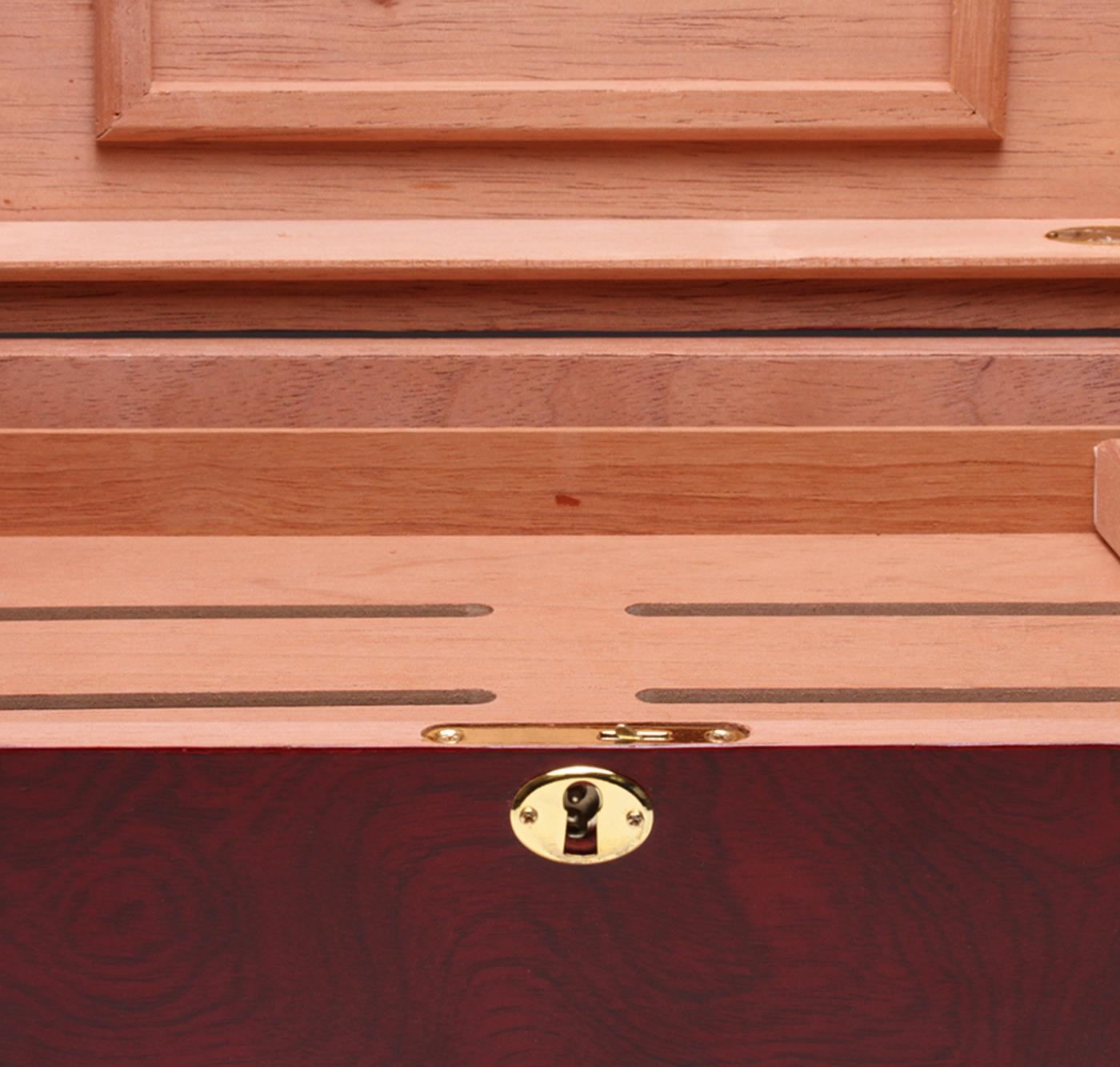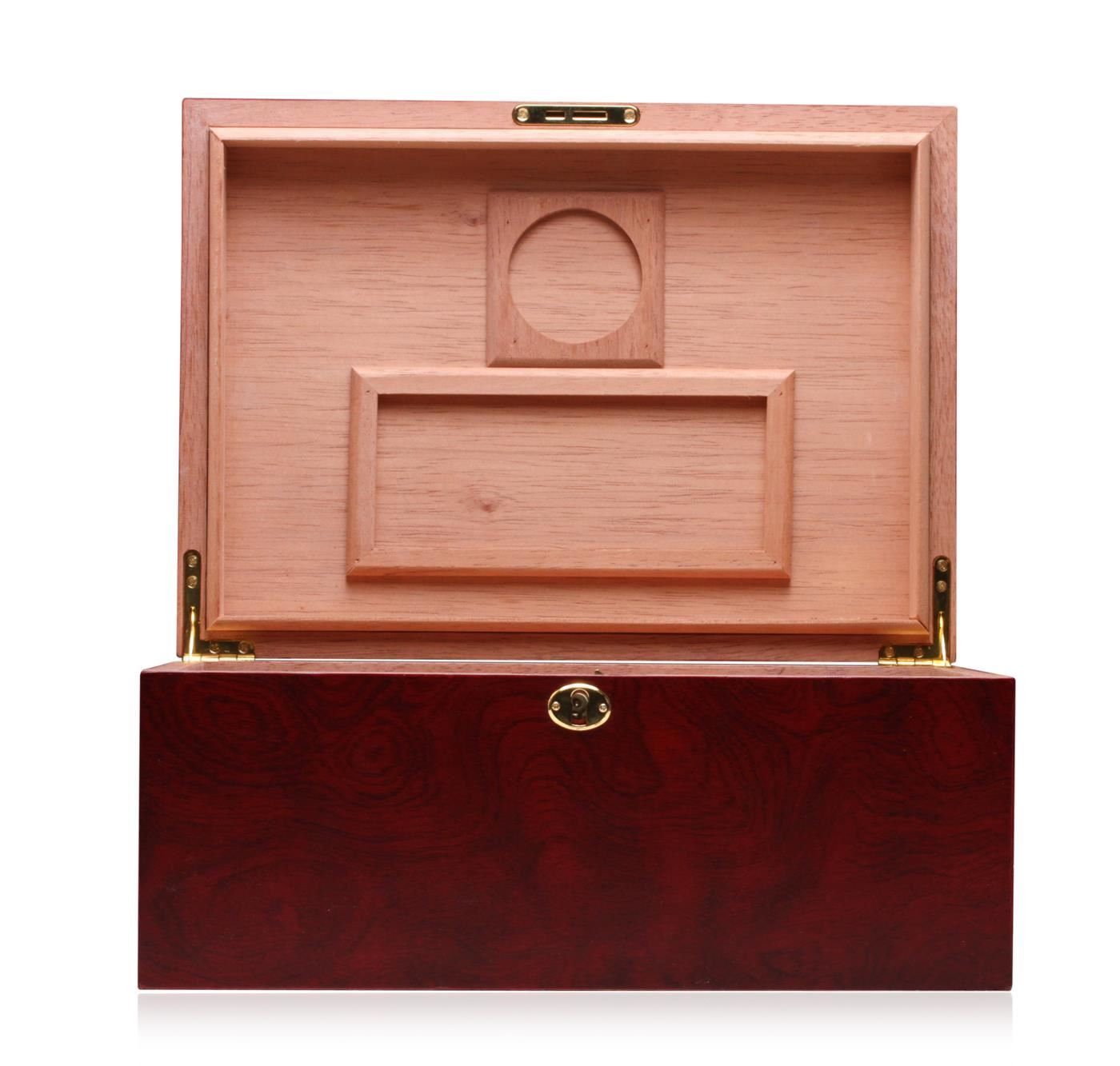 One deluxe cigar humidor featuring a glossy cherry wood exterior lined with premium Spanish cedar and solid brass hardware. Beautifully handcrafted to provide your cigars with the perfect environment for storage. This deluxe humidor will surely enhance your cigars smell and taste. Includes: Humidor, Hygrometer, Humidification System, Accessories, Instructions Manual. Measures 12 x 6 x 9.25 inches.