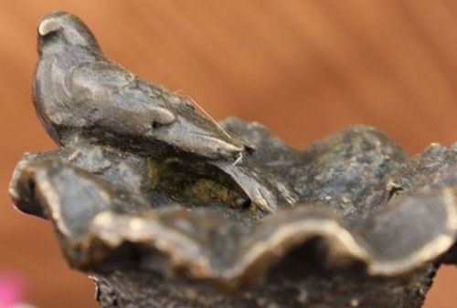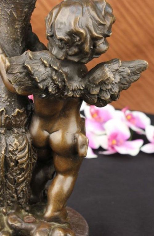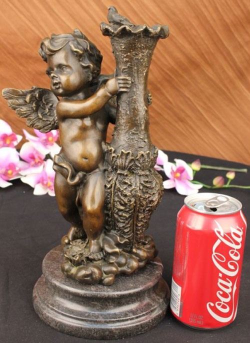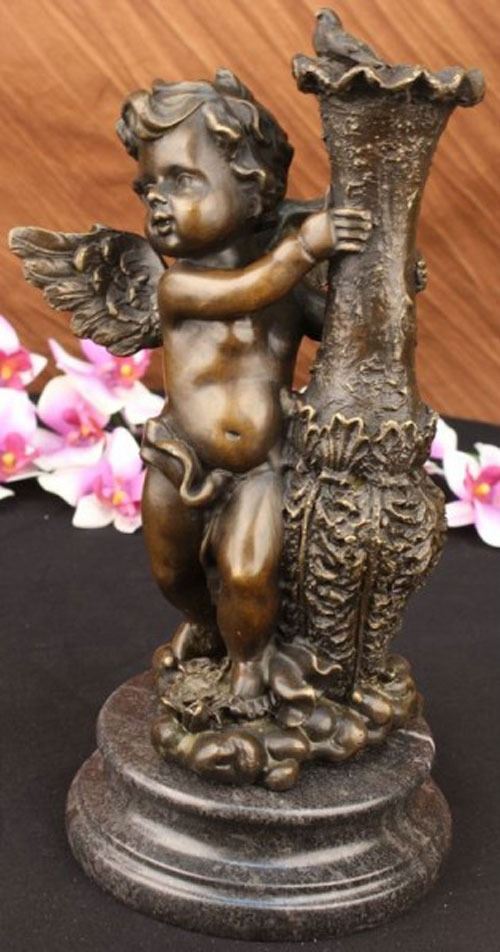 The cherubic angel seems to have just landed from great heights among the ruins of an old enchanted garden. He holds himself steady from the fall to earth against a forgotten water jug. His wings begin to flutter shut as his eyes begin to assimilate and search for the divine purpose of his journey. On the lip of the jug perches a dove who followed the angel from the open skies. This bronze sculpture was captured using the archaic method of lost-wax casting and stained with a brown patina finish for perpetuation and mounted upon a marble base. Dimensions: Height 12 X Width 6 inches. Weight: 9 LBS.