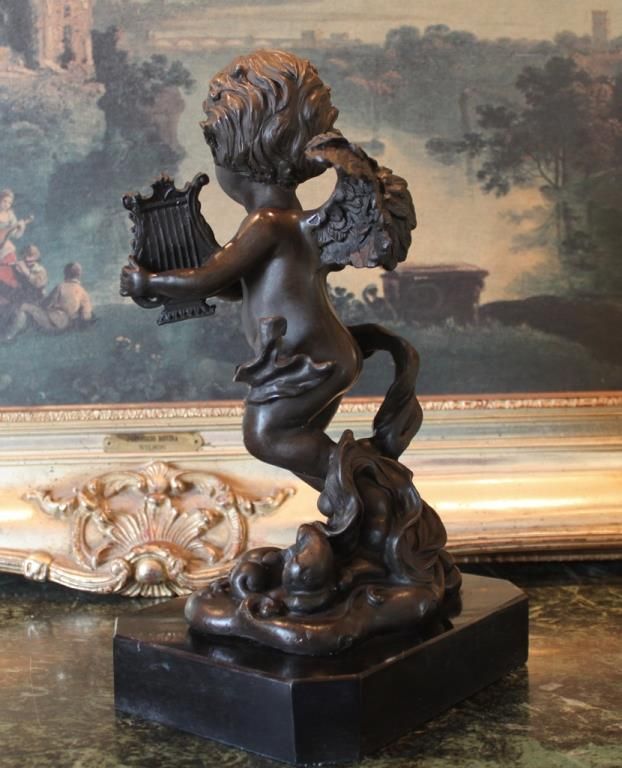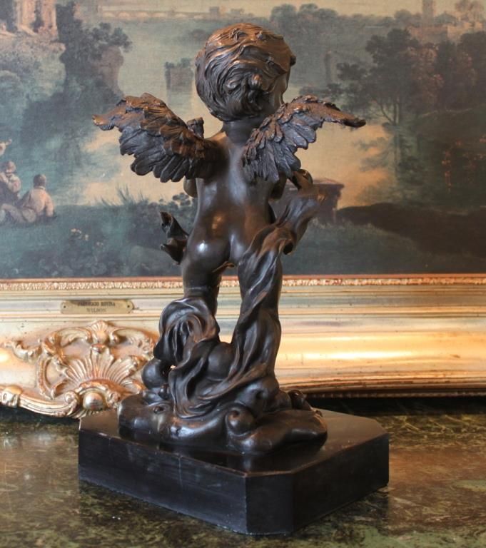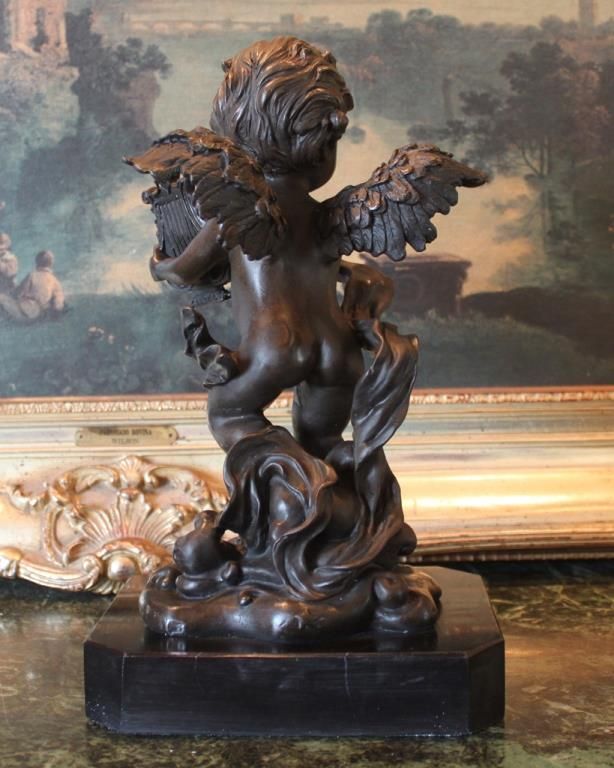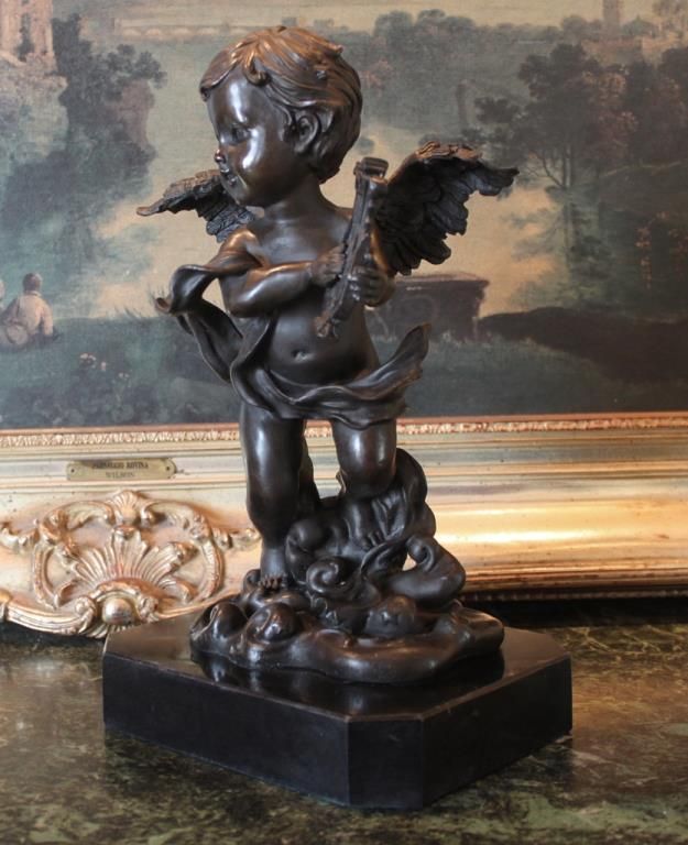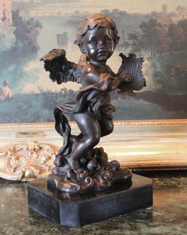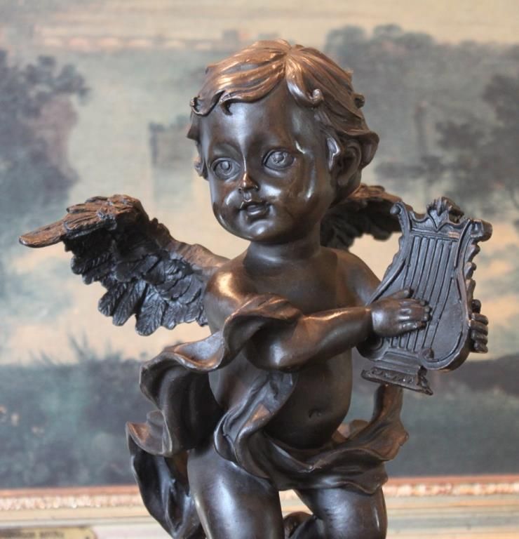 Cherub Bronze Sculpture, 13h x 7.75w x 6.25d, 17 lbs. This bronze sculpture was produced using the "Lost Wax" casting method. The "Lost Wax" Cast method is the most precise metal casting technique in existence, ensuring exquisite detail of the original host model which is usually sculpted in clay or wax. This "Lost Wax" casting method is an extremely labor intensive and expensive process, but the end results produce a Heirloom Quality Masterpiece!