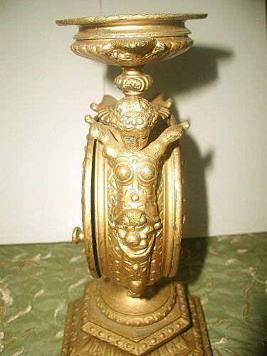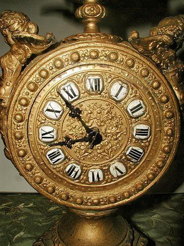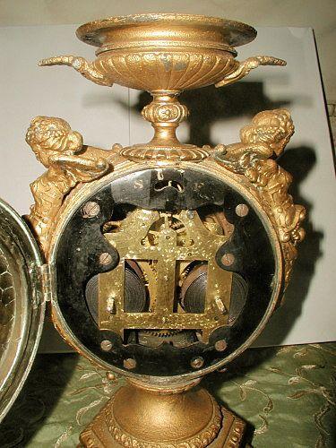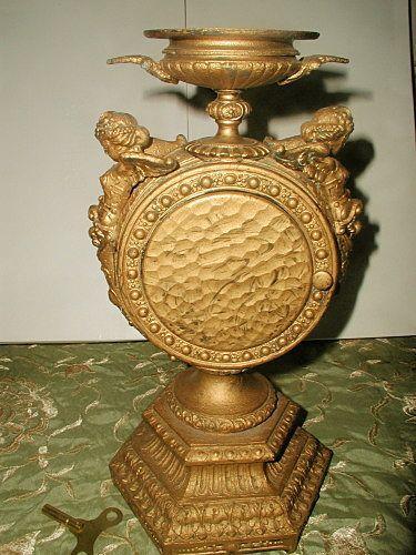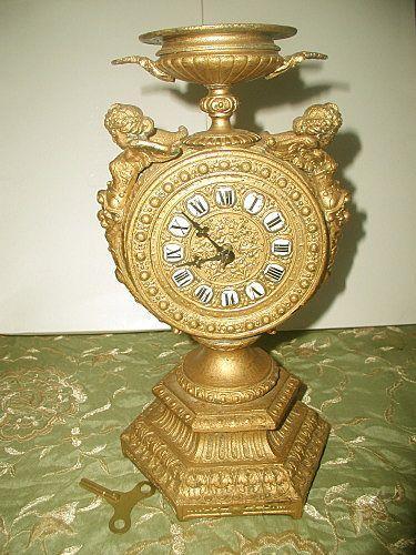 C.1890-1900 8 day Mayer gilt cherub clock with French urn styling.Porcelain Roman numeral face with new black ornate hands. Decorative trim surrounds the face with cherubs either side. Double springs for winding with attached new key,no chime. The interior of the top urn is copper,the inside of the door with small broken latch taped to the door is patterned brass. The remainder of the clock has been painted with gilt gold paint over the years,so unable to distinguish what the metal beneath might be. Has been professionally cleaned, new bushings added and adjusted. Works wonderfully,gaining approximately 5 minutes in 24 hours. Minor adjustment should correct upon arrival. Minor wear to paint as seen otherwise excellent condition. Handsome addition to any mantel,chest or table. Measures 14H X 6.75L X 6.75D.