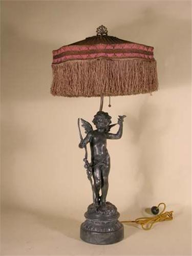 Cherub lamp with Victorian shade - signed August Morean, Paris, France. Ex. cond.