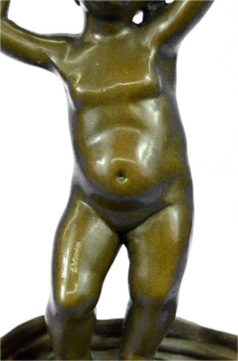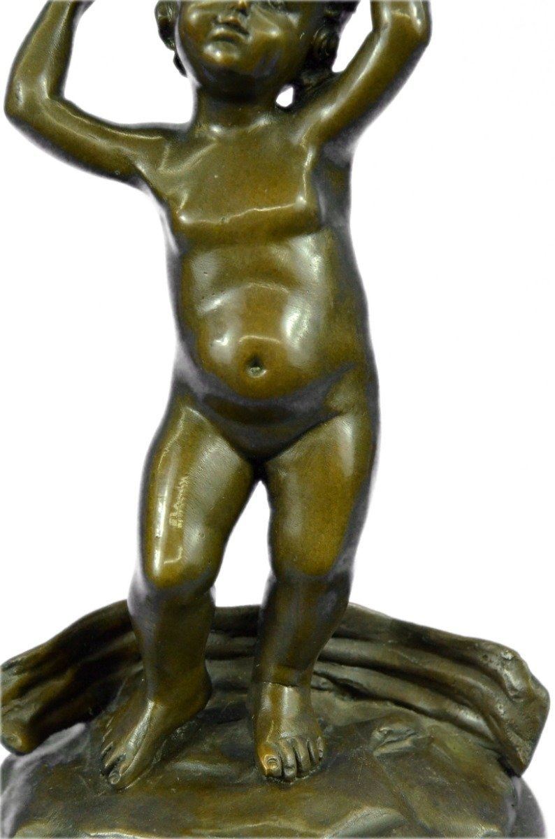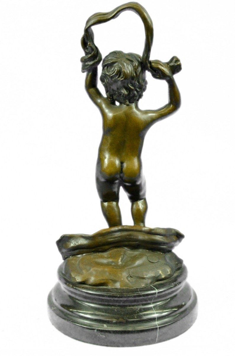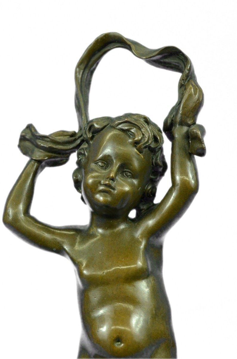The nude, cherub-like child stands in a relaxed contrapposto pose. Hisarms outstretch above him waving a fabric banner in a carefree andjoyful manner. The 100% bronze sculptures tactility captures theviewer with his chubby contour and smooth, brown patina finish. Thisangelic sculpture was cast using the ancient Lost Wax Method andmounted upon a black marble base. Bronze Dimensions with Marble Base: Height 11 X Width 6 inches. Weight: 8 LBS. Inventory: 27DS2612772