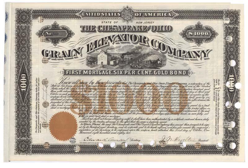 1882, New Jersey. $1000 Gold bond bearing 6% interest. Black with gold $1000 underprint and seal. Vignette of a train departing a grain elevator and fields. Full coupons attached. Signed by C.P. Huntington as President of the Chesapeake & Ohio Railway Co. as guaranteer. Collis P. Huntington (1821-1900). One of the most important railroad builders in American history. Excellent condition. Hole punch cancelled with two affecting Huntington's signature.
