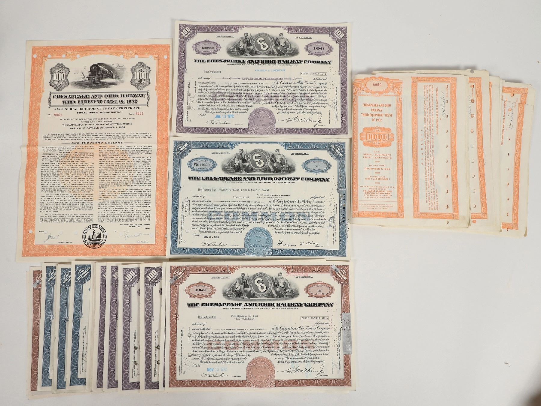 About 30 issued stock certificates in The Chesapeake and Ohio Railway Company, circa 1970s. About 30 Equipment Trust Certificates of 1952 with locomotive vignette.
