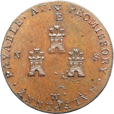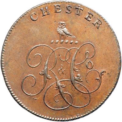 Cheshire. Chester. Halfpenny, ND. D&H-5. Edge: Engrailed. Three castles. Reverse: A cypher. NGC graded MS-65 Brown.