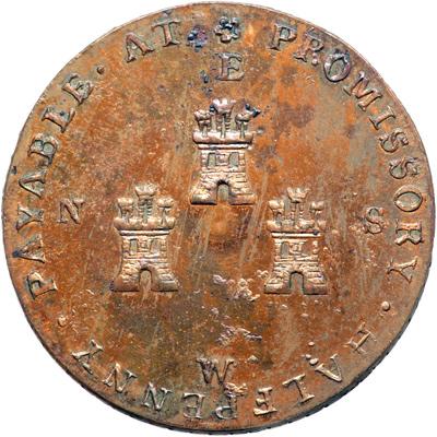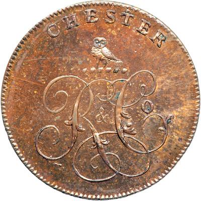 Cheshire. Chester. Halfpenny, ND. D&H-5. Edge: Engrailed. Three castles. Reverse: A cypher. NGC graded MS-64 Red & Brown.
