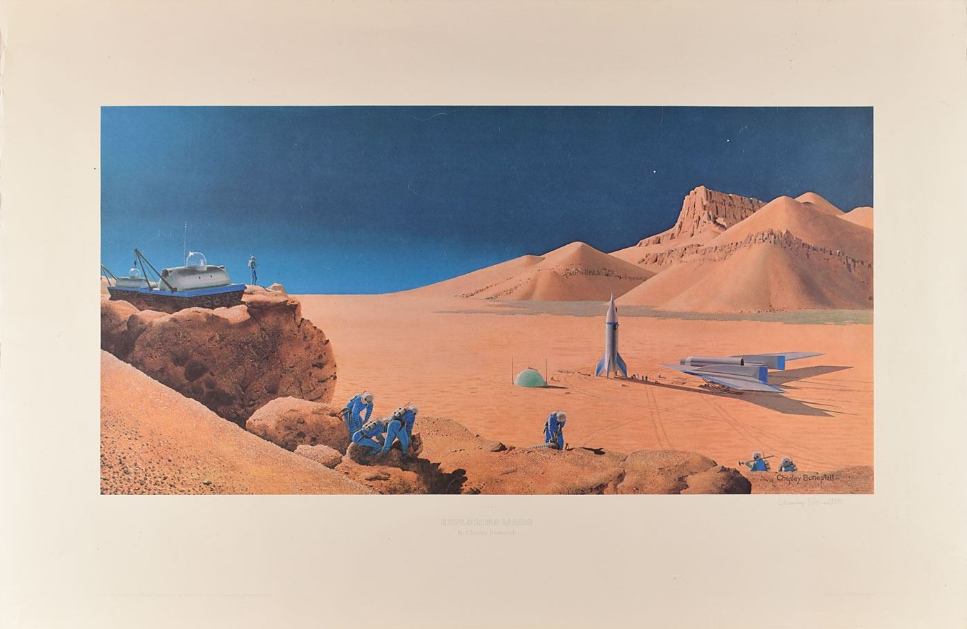 Attractive color 36 x 23.5 print of a 1956 painting by Chesley Bonestell entitled 'Exploring Mars,' which depicts several astronauts and machines on the Martian terrain, signed in the lower right in pencil by the artist. In fine condition, with some light creasing in the margins. This painting was used for the 1956 book The Exploration of Mars, which featured articles by space notables like by Willy Ley, Fred Lawrence Whipple, and Dr. Joseph Kaplan. The articles focused on Wernher von Braun's plans for manned spaceflight, and were originally published as part of the 'Man Will Conquer Space Soon!' articles in Collier's Magazine.